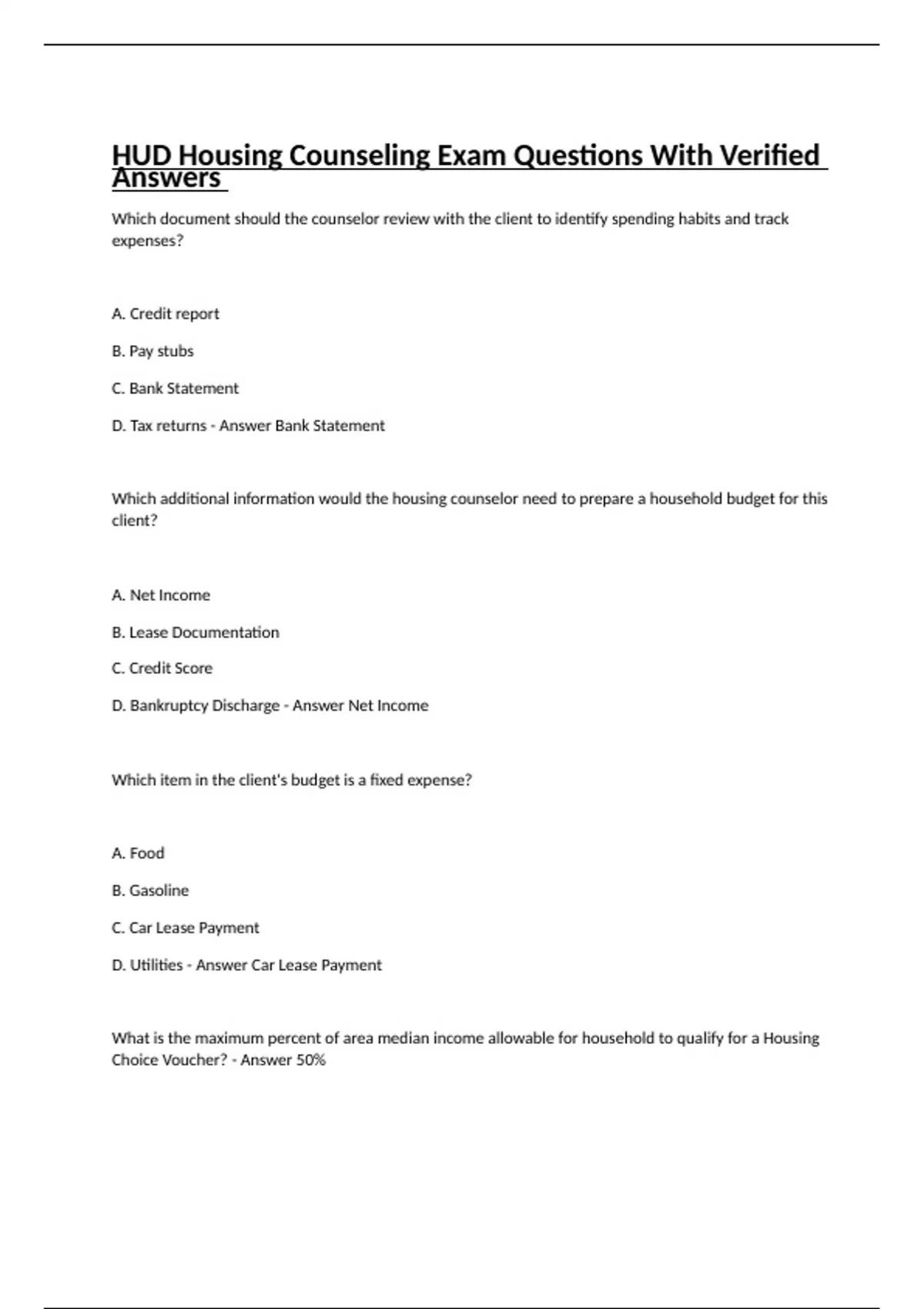 HUD Housing Counseling Exam Questions With Verified Answers