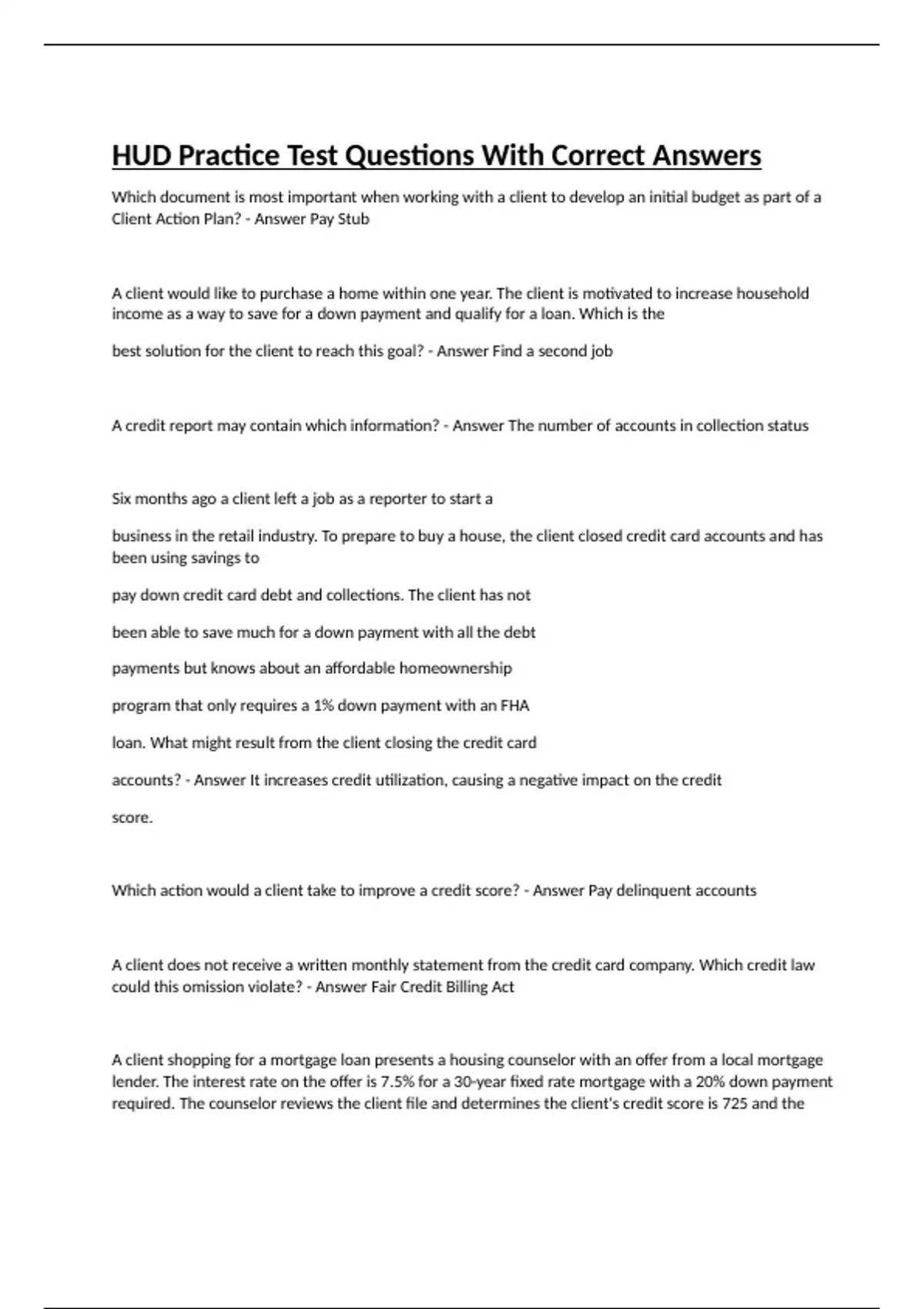 Which document is most important when working with a client to develop an initial budget as part of a Client Action Plan? - Answer Pay Stub A client would like to purchase a home within one year. The client is motivated to increase household income as a way to save for a down payment and qualify for a loan. Which is the best solution for the client to reach this goal? - Answer Find a second job A credit report may contain which information? - Answer The number of accounts in collection status Six months ago a client left a job as a reporter to start a business in the retail industry. To prepare to buy a house, the client closed credit card accounts and has been using savings to pay down credit card debt and collections. The client has not been able to save much for a down payment with all the debt payments but knows about an affordable homeownership program that only requires a 1% down payment with an FHA loan. What might result from the client closing the credit card accounts? - Answer It increases credit utilization, causing a negative impact on the credit score. Which action would a client take to improve a credit score? - Answer Pay delinquent accounts A client does not receive a written monthly statement from the credit card company. Which credit law could this omission violate? - Answer Fair Credit Billing Act A client shopping for a mortgage loan presents a housing counselor with an offer from a local mortgage lender. The interest rate on the offer is 7.5% for a 30-year fixed rate mortgage with a 20% down payment required. The counselor reviews the client file and determines the client's credit score is 725 and the client's total debt-to-income ratio is 20%. - Answer "I am unable to determine whether the loan is predatory, but I suggest you shop around with other lending sources." Which action should a counselor recommend a client take first after discovering identity theft? - Answer File an identity theft report In which situation would a client's responsibilities, recurring costs, and upfront costs be evaluated? - Answer When weighing housing options A client works 40 hours a week making $15 an hour. What is the highest monthly mortgage the client can afford based on income if the client secures a conventional loan? - Answer $728 Which type of government insured loan was created for financing homes in rural areas? - Answer USDA A client keeps having budget problems due to unexpected expenses. Which financial tool would best assist this client to prepare for unexpected expenses and avoid increasing credit usage? - Answer Emergency Funds A client has a monthly household income of $2,300, monthly debt payments of $450, and an optimal monthly housing ratio of 32%. What is the client's optimal monthly housing payment? - Answer $736 Use Front-End Ratio What is the back-end ratio for a client with a monthly housing expense of $1,250, a monthly total of $88 in other consumer debt payments, and a gross household income of $4,460 per month (rounded to the nearest whole percent)? - Answer 30% A client earns a salary of $45,000 at a job held for three years. The client has credit card bills, student loans, and a car loan totaling $500 per month. The client has already saved $3,500 for a down payment and is using an FHA Energy Efficient Mortgage (EEM). If the client wants to make the minimum down payment for a home priced at $150,000, how much more does the client need to save? - Answer $1,750 Under which condition would most down payment assistance programs approve a waiver of the homeownership education requirement? - Answer Most will not waive the homeownership education requirement. Which type of assistance administered by a public housing authority allows for location flexibility? - Answer Tenant-based vouchers