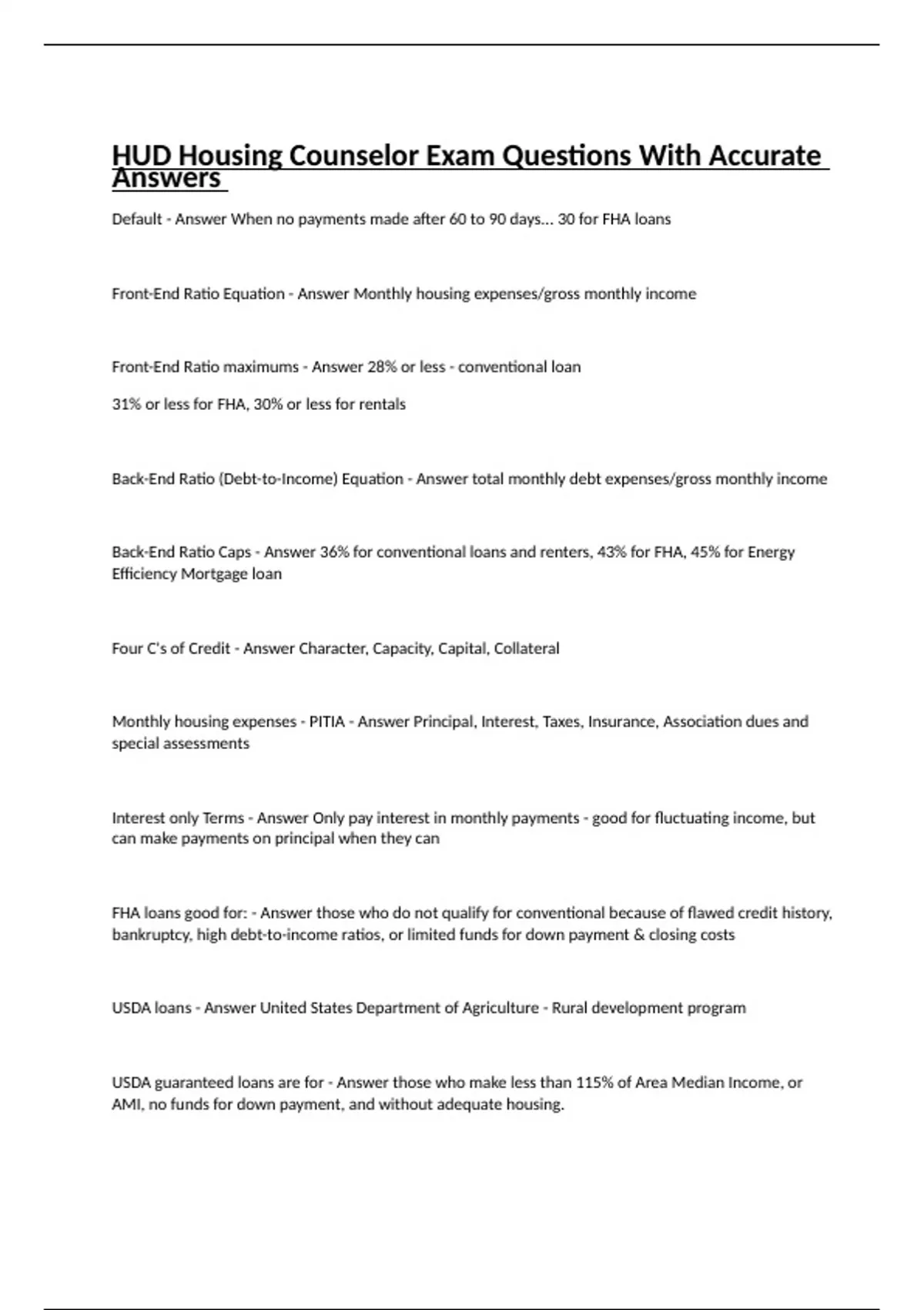 Default - Answer When no payments made after 60 to 90 days... 30 for FHA loans Front-End Ratio Equation - Answer Monthly housing expenses/gross monthly income Front-End Ratio maximums - Answer 28% or less - conventional loan 31% or less for FHA, 30% or less for rentals Back-End Ratio (Debt-to-Income) Equation - Answer total monthly debt expenses/gross monthly income Back-End Ratio Caps - Answer 36% for conventional loans and renters, 43% for FHA, 45% for Energy Efficiency Mortgage loan Four C's of Credit - Answer Character, Capacity, Capital, Collateral Monthly housing expenses - PITIA - Answer Principal, Interest, Taxes, Insurance, Association dues and special assessments Interest only Terms - Answer Only pay interest in monthly payments - good for fluctuating income, but can make payments on principal when they can FHA loans good for: - Answer those who do not qualify for conventional because of flawed credit history, bankruptcy, high debt-to-income ratios, or limited funds for down payment & closing costs USDA loans - Answer United States Department of Agriculture - Rural development program USDA guaranteed loans are for - Answer those who make less than 115% of Area Median Income, or AMI, no funds for down payment, and without adequate housing. USDA Direct loans are for - Answer those who make less than 80% of AMI, unable to obtain other financing but have reasonable credit... loans can go for up to 33 or 38 years Mortgage Insurance - Answer Protects lender if you stop making payments, Required if down payment is less than 20% of home value 2nd Mortgage - "Piggy back" - Answer assures 1st mortgage is only 80% of sales price -- will mean higher interest rates and more fees Loan to Value Ratio -- LTV Ratio - Answer % calculated by dividing the amount of outstanding loan amount by the value of home Lender must terminate PMI when LTV ratio reaches: - Answer 78% OR at midpoint of loan, i.e. 15 years of 30 year mortgage Adjustable Rate Mortgage - Answer 30 year, interest rate set for 1st 5 years then adjusts annually ARM good for: - Answer Those who have $ for down payment, wants lower interest rate for few years and may not own home for more than 5 years Federal Housing Choice Voucher Program - Section 8 - Distributed by local Public Housing Agency, or PHA - Answer Family income must be lower than 50% of AMI, Voucher must pay 30% of gross income, family pays the rest Redlining - Answer Illegal Practice of refusing to make loans because of predominant race, color, national origin, religion, sec, disability or familial status of the residents in the neighborhood Blockbusting - Answer Trying to convince someone to sell or rent a dwelling because of the entry into the neighborhood of a particular person 1954 Brown vs Board of Education - Answer Supreme Court says GOV can longer support segregated programs Civil Acts Right of 1964 - Answer No discrimination in programs that receive federal funding Civil Acts Right of 1968 - Answer Title VIII - "Fair Housing Act - prohibited discrimination in housing sales, rentals and financing based on race, color, national origin and religion. How long you have to file a complaint - Answer 12 months after incident occurred. Fair Housing Act now protects how many characteristics? - Answer 7 -- race, color, national origin, religion, sex, disability, and familial status Reasonable Modification - Answer Structural modification made to allow persons with disabilities full enjoyment of facilities Reasonable Accommodation - Answer Change in rules, policies, practices, or services Fair Housing Assistance Program - Answer FHAP - Provides funding to state and local agencies to help enforce fair housing laws. Fair Housing Initiatives Program - Answer FHIP - Provides funding to fair housing organizations and nonprofits that assist possible victims of housing discrimination Process of Filing a Complaint - Answer Intake, Filing, Investigation, Pre-determination Conciliation Marketing Analysis - Answer Aims to identify groups of ppl who would benefit most if targeted by the campaign, their characteristics, and their expectations To assist clients who may utilize them, counselors should research AFFH rules for: - Answer HUD-funded program Designed to help State or Local jurisdictions to access housing development needs - Answer Consolidated Plan URLA form - Answer Uniform Residential Loan Application -- Outlines client's financial history -- loan info, property info, personal info, income, debt, assets ECOA - Answer Equal Credit Opportunity Act -- requires lenders to make credit available equally -- file complaint to FTC RESPA - Answer Real Estate Settlement Procedures Act -- prohibits abusive practices that increase cost of settlement AND requires transaction disclosures describing closing costs, lending services, etc. -- file complaint to Consumer Finance Protection Bureau TILA - Answer Truth in Lending Act -- Lenders must provide loan costs info so they can shop around -- file complaint to FTC TRID - Answer TILA-RESPA Integrated Disclosure Rule -- "Know before you Owe" rule - requires easy to use disclosures -- Loan Estimate to help understand key features, costs and risks of loan AND Closing Disclosure to help understand all costs of transactions HOEPA - Answer Home Ownership and Equity Protections Act -- to address abusive practices in refinances and closed-ended home equity loans with high interest rates or high fees Two pamphlets counselors must provide on home inspections - Answer For your protection get a home inspection AND 10 questions to ask a home imspector Type of Homeowner's insurance that reimburses for repairs for damage from perils - Answer Structure Coverage Type of Homeowner's insurance that provides funding for housing and food when you cant live in home - Answer Loss-of-Use Coverage Type of Homeowner's insurance that reimburses for personal property destroyed by perils - Answer Contents Coverage Type of Homeowner's insurance that provides funding for 