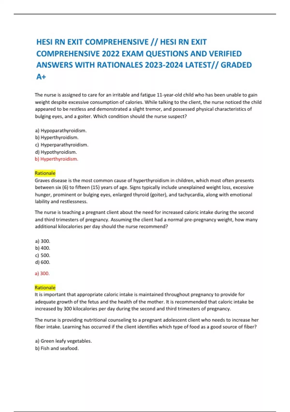 HESI RN EXIT COMPREHENSIVE // HESI RN EXIT COMPREHENSIVE 2022 EXAM QUESTIONS AND VERIFIED ANSWERS WITH RATIONALES LATEST// GRADED A+ The nurse is assigned to care for an irritable and fatigue 11-year-old child who has been unable to gain weight despite excessive consumption of calories. While talking to the client, the nurse noticed the child appeared to be restless and demonstrated a slight tremor, and possessed physical characteristics of bulging eyes, and a goiter. Which condition should the nurse suspect? HESI RN EXIT COMPREHENSIVE // HESI RN EXIT COMPREHENSIVE 2022 EXAM QUESTIONS AND VERIFIED ANSWERS WITH RATIONALES LATEST// GRADED A+ The nurse is assigned to care for an irritable and fatigue 11-year-old child who has been unable to gain weight despite excessive consumption of calories. While talking to the client, the nurse noticed the child appeared to be restless and demonstrated a slight tremor, and possessed physical characteristics of bulging eyes, and a goiter. Which condition should the nurse suspect? HESI RN EXIT COMPREHENSIVE // HESI RN EXIT COMPREHENSIVE 2022 EXAM QUESTIONS AND VERIFIED ANSWERS WITH RATIONALES LATEST// GRADED A+ The nurse is assigned to care for an irritable and fatigue 11-year-old child who has been unable to gain weight despite excessive consumption of calories. While talking to the client, the nurse noticed the child appeared to be restless and demonstrated a slight tremor, and possessed physical characteristics of bulging eyes, and a goiter. Which condition should the nurse suspect? HESI RN EXIT COMPREHENSIVE // HESI RN EXIT COMPREHENSIVE 2022 EXAM QUESTIONS AND VERIFIED ANSWERS WITH RATIONALES LATEST// GRADED A+ The nurse is assigned to care for an irritable and fatigue 11-year-old child who has been unable to gain weight despite excessive consumption of calories. While talking to the client, the nurse noticed the child appeared to be restless and demonstrated a slight tremor, and possessed physical characteristics of bulging eyes, and a goiter. Which condition should the nurse suspect? HESI RN EXIT COMPREHENSIVE // HESI RN EXIT COMPREHENSIVE 2022 EXAM QUESTIONS AND VERIFIED ANSWERS WITH RATIONALES LATEST// GRADED A+ The nurse is assigned to care for an irritable and fatigue 11-year-old child who has been unable to gain weight despite excessive consumption of calories. While talking to the client, the nurse noticed the child appeared to be restless and demonstrated a slight tremor, and possessed physical characteristics of bulging eyes, and a goiter. Which condition should the nurse suspect?