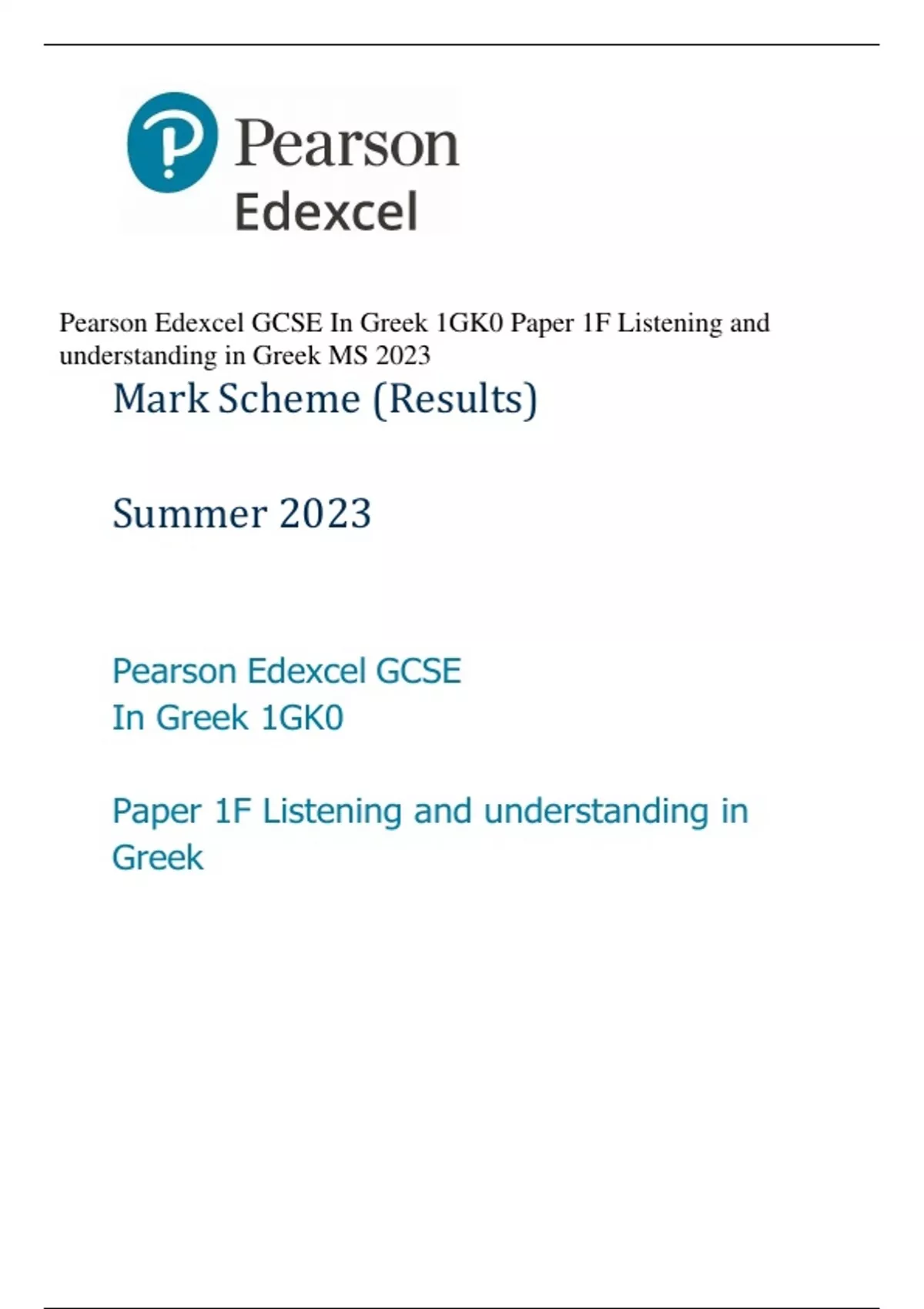 Pearson Edexcel GCSE In Greek 1GK0 Paper 1F Listening and