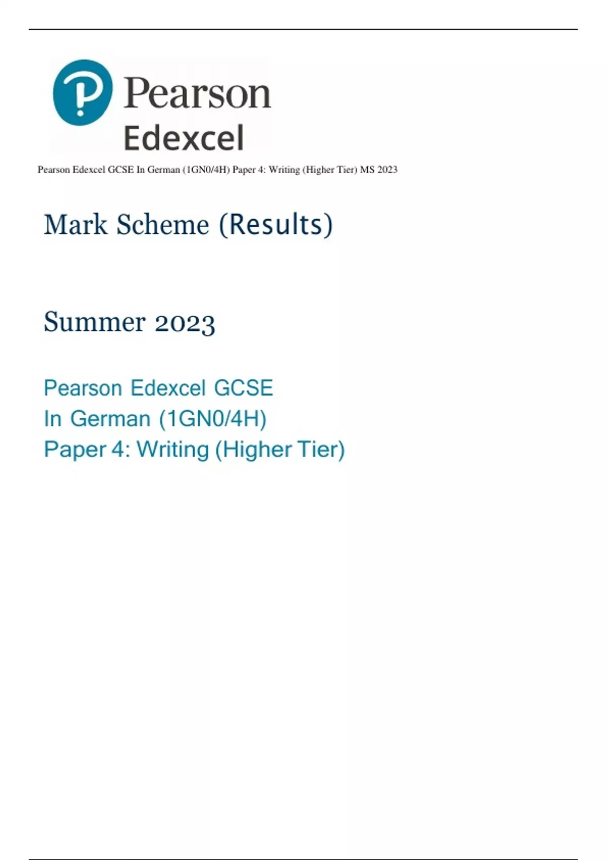 Pearson Edexcel GCSE In German (1GN0/4H) Paper 4: Writing (Higher Tier) MS 2023