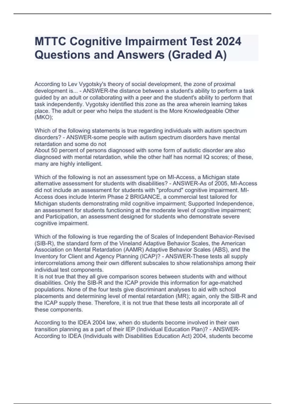 MTTC Cognitive Impairment Test 2024 Questions and Answers (Graded A)MTTC Cognitive Impairment Test 2024 Questions and Answers (Graded A)MTTC Cognitive Impairment Test 2024 Questions and Answers (Graded A) According to Lev Vygotsky's theory of social development, the zone of proximal development is... - ANSWER-the distance between a student's ability to perform a task guided by an adult or collaborating with a peer and the student's ability to perform that task independently. Vygotsky identified this zone as the area wherein learning takes place. The adult or peer who helps the student is the More Knowledgeable Other (MKO); Which of the following statements is true regarding individuals with autism spectrum disorders? - ANSWER-some people with autism spectrum disorders have mental retardation and some do not About 50 percent of persons diagnosed with some form of autistic disorder are also diagnosed with mental retardation, while the other half has normal IQ scores; of these, many are highly intelligent. Which of the following is not an assessment type on MI-Access, a Michigan state alternative assessment for students with disabilities? - ANSWER-As of 2005, MI-Access did not include an assessment for students with "profound" cognitive impairment. MI-