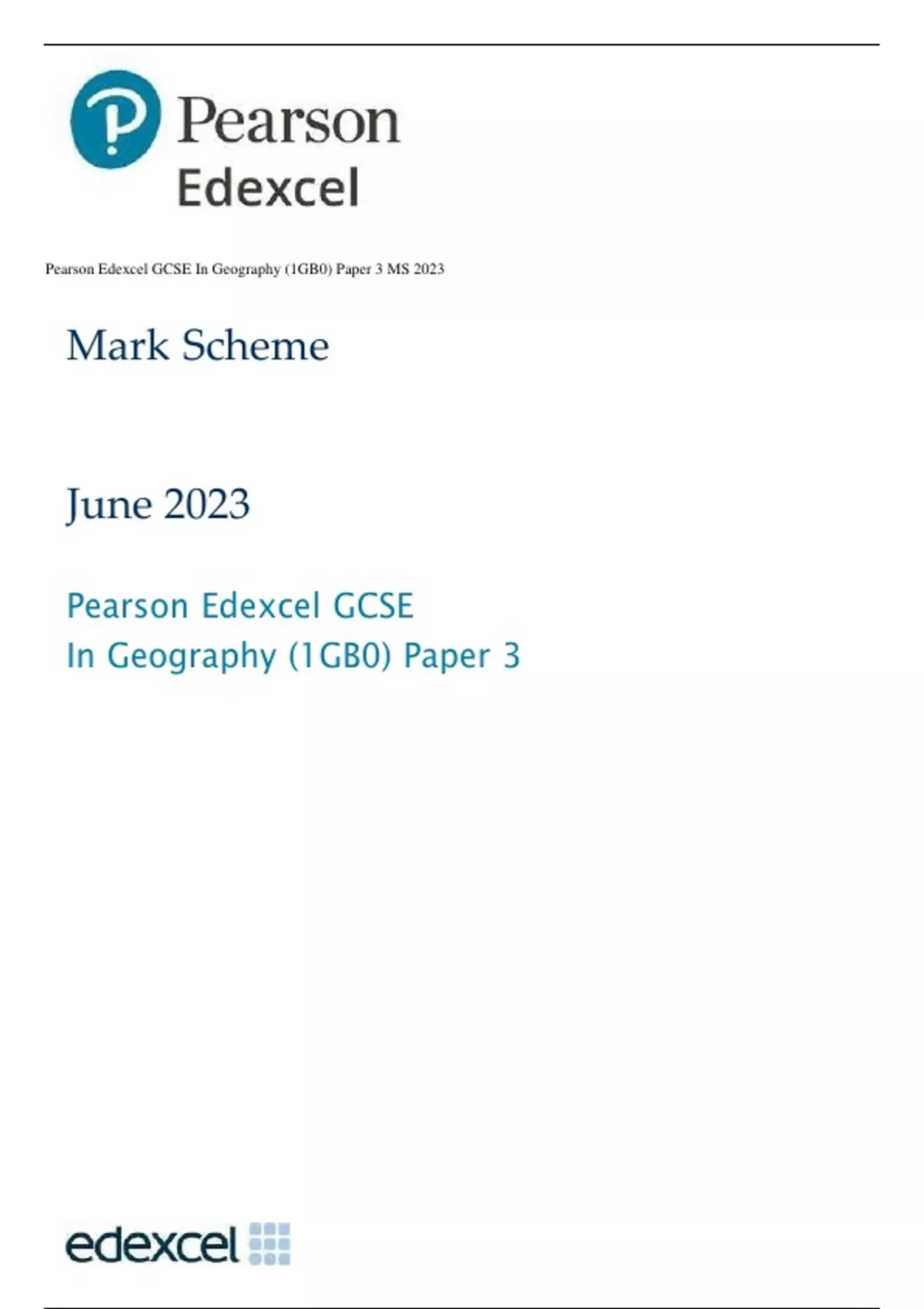 Pearson Edexcel GCSE In Geography (1GB0) Paper 3 MS 2023