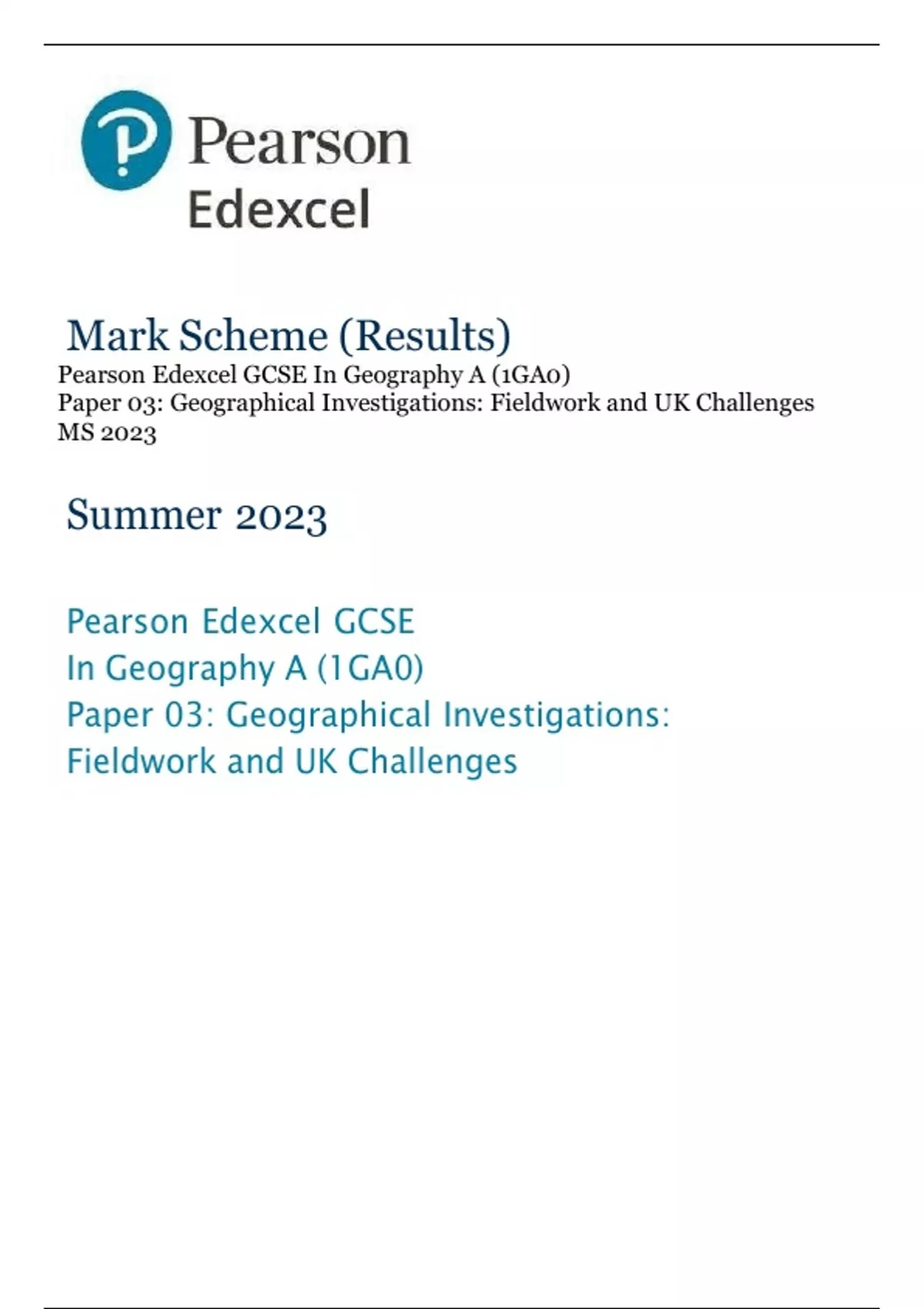 Pearson Edexcel GCSE In Geography A (1GA0) Paper 03: Geographical Investigations: Fieldwork and UK Challenges MS 2023