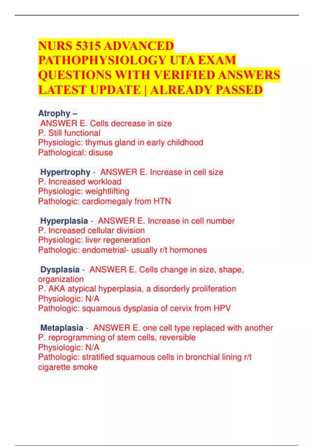 NURS 5315 ADVANCED PATHOPHYSIOLOGY UTA EXAM QUESTIONS WITH VERIFIED ANSWERS LATEST UPDATE | ALREADY PASSED Atrophy – ANSWER E. Cells decrease in size P. Still functional Physiologic: thymus gland in early childhood Pathological: disuse Hypertrophy - ANSWER E. Increase in cell size P. Increased workload Physiologic: weightlifting Pathologic: cardiomegaly from HTN Hyperplasia - ANSWER E. Increase in cell number P. Increased cellular division Physiologic: liver regeneration Pathologic: endometrial- usually r/t hormones Dysplasia - ANSWER E. Cells change in size, shape, organization P. AKA atypical hyperplasia, a disorderly proliferation Physiologic: N/A Pathologic: squamous dysplasia of cervix from HPV Metaplasia - ANSWER E. one cell type replaced with another P. reprogramming of stem cells, reversible Physiologic: N/A Pathologic: stratified squamous cells in bronchial lining r/t cigarette smoke Hypoxia injury - ANSWER E. inadequate oxygenation of tissues P. decrease in mitochondrial function, decreased production of ATP increases anaerobic metabolism. eventual cell death. C.M. hypoxia, cyanosis, cognitive impairment, lethargy Free radical and ROS - ANSWER E. normal byproduct of ATP production, will overwhelm the mitochondria- exhaust intracellular antioxidants P. lipid peroxidation, damage proteins, fragment DNA C.M. development in Alzheimer's, heart disease, Parkinson's disease, Amyotrophic Lateral Sclerosis Ethanol - ANSWER E. mood altering drug, long term effects on liver and nutritional status P. metabolized by liver, generates free radicals C.M. CNS depression, nutrient deficiencies-Mag, Vit B6, thiamine, PO4, inflammation and fatty infiltration of liver, hepatomegaly, leads to liver failure irreversible Oncosis - ANSWER Na and H2O enter cell and cause swelling. Organ increases in weight, becomes distended and pale. Associated with high fever, hypocalcemia, certain infections Fatty Infiltration - ANSWER intracellular accumulation of lipids in the liver liver fails to metabolize lipids. usually from ETOH or high fat diet. can lead to cirrhosis dystrophic calcification - ANSWER accumulation of Ca in dead or dying tissues calcium salt clump and harden- interfere with cellular structure and function r/t pulmonary TB, atherosclerosis, injured heart valves, chronic pancreatitis metastatic calcification - ANSWER accumulation of Ca in normal tissue result of hypercalcemia r/t hyperparathyroidism, hyperthyroidism, toxic levels of Vit D. Can also r/t hyperphosphatemia in renal failure urate accumulation - ANSWER sodium urate crystals are deposited in tissues- group of disorders collectively called goutacute arthritis, chronic gouty arthritis, tophus, nephritis Coagulative Necrosis - ANSWER kidneys, heart, adrenalssecondary to hy