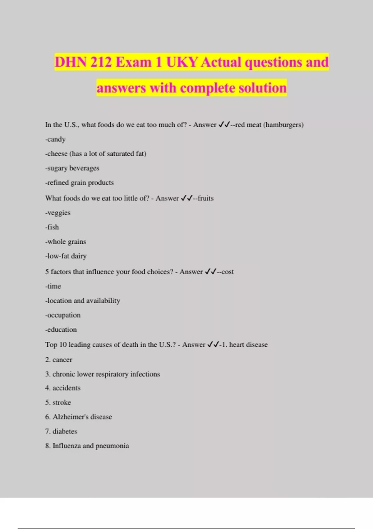 DHN 212 Exam 1 UKY Actual questions and answers with complete solution In the U.S., what foods do we eat too much of? - Answer ️️ --red meat (hamburgers) -candy -cheese (has a lot of saturated fat) -sugary beverages -refined grain products What foods do we eat too little of? - Answer ️️ --fruits -veggies -fish -whole grains -low-fat dairy 5 factors that influence your food choices? - Answer ️️ --cost -time -location and availability -occupation -education Top 10 leading causes of death in the U.S.? - Answer ️️ -1. heart disease 2. cancer 3. chronic lower respiratory infections 4. accidents 5. stroke 6. Alzheimer's disease 7. diabetes 8. Influenza and pneumonia 9. kidney disease 10. suicide Causes of death related to diet/physical activity? - Answer ️️ --heart disease -cancer -stroke -Alzheimer's disease -diabetes -kidney disease What is Healthy People 2020? - Answer ️️ --reduce the proportion of adults who are obese -increase the contribution of fruits to the diets of the population aged 2 years and up -increase the contribution of whole grains -reduce calories from saturated fats and sugars What are the 6 classes of nutrients? - Answer ️️ -1. carbohydrates 2. lipids (fats and oils) 3. proteins 4. vitamins 5. minerals 6. water Which nutrients provide energy? - Answer ️️ -carbohydrates, fats (lipids), and proteins What percentage of a typical adult's body weight is water? - Answer ️️ -50-70% Body composition of a female? - Answer ️️ -on average, 57% body water, have more fat and less muscle Body composition of a male? - Answer ️️ -on average 62% body water, have less fat and more muscle Elements found in water? - Answer ️️ -oxygen and hydrogen Elements found in carbohydrates? - Answer ️️ -carbon, oxygen, and hydrogen Elements found in fat? - Answer ️️ -carbon, oxygen, and hydrogen Elements found in protein? - Answer ️️ -carbon, oxygen, hydrogen, and nitr
