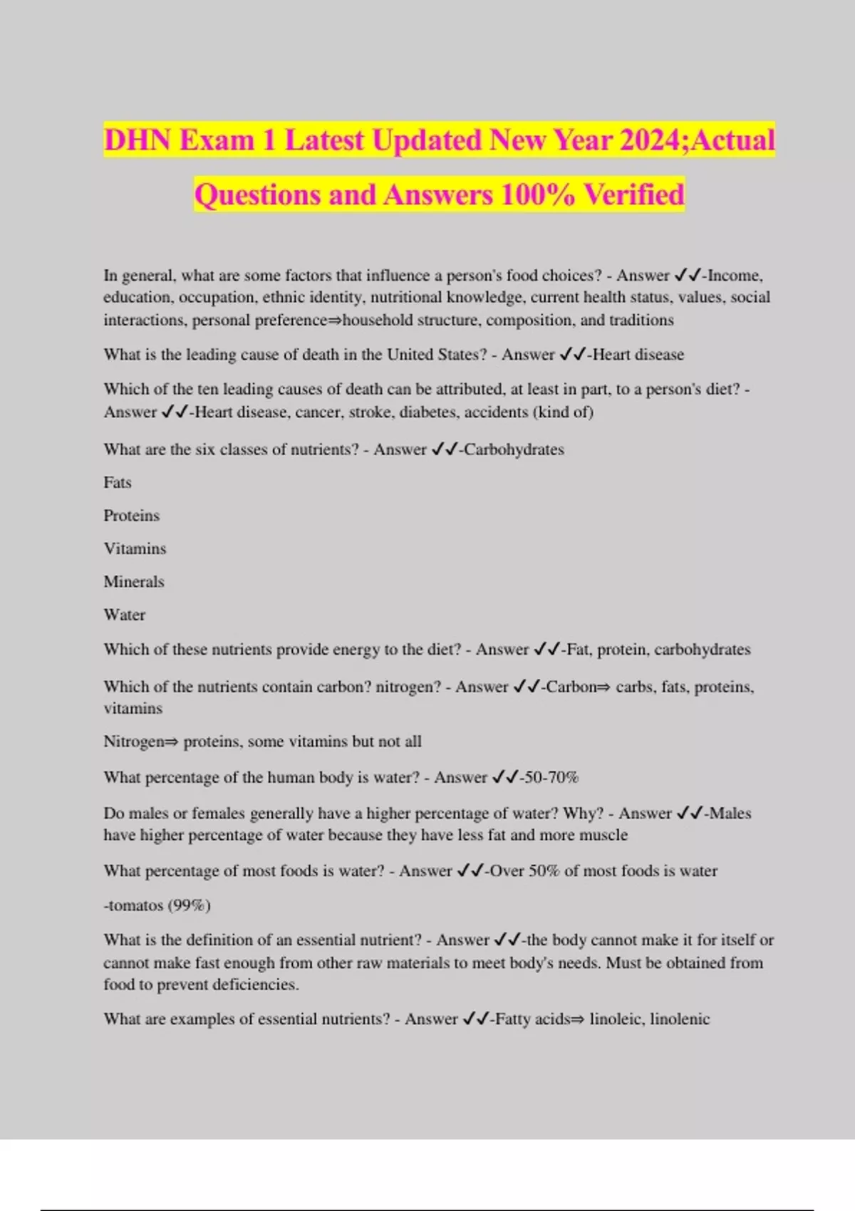 DHN Exam 1 Latest Updated New Year 2024;Actual Questions and Answers 100% Verified In general, what are some factors that influence a person's food choices? - Answer ️️ -Income, education, occupation, ethnic identity, nutritional knowledge, current health status, values, social interactions, personal preference⇒household structure, composition, and traditions What is the leading cause of death in the United States? - Answer ️️ -Heart disease Which of the ten leading causes of death can be attributed, at least in part, to a person's diet? - Answer ️️ -Heart disease, cancer, stroke, diabetes, accidents (kind of) What are the six classes of nutrients? - Answer ️️ -Carbohydrates Fats Proteins Vitamins Minerals Water Which of these nutrients provide energy to the diet? - Answer ️️ -Fat, protein, carbohydrates Which of the nutrients contain carbon? nitrogen? - Answer ️️ -Carbon⇒ carbs, fats, proteins, vitamins Nitrogen⇒ proteins, some vitamins but not all What percentage of the human body is water? - Answer ️️ -50-70% Do males or females generally have a higher percentage of water? Why? - Answer ️️ -Males have higher percentage of water because they have less fat and more muscle What percentage of most foods is water? - Answer ️️ -Over 50% of most foods is water -tomatos (99%) What is the definition of an essential nutrient? - Answer ️️ -the body cannot make it for itself or cannot make fast enough from other raw materials to meet body's needs. Must be obtained from food to prevent deficiencies. What are examples of essential nutrients? - Answer ️️ -Fatty acids⇒ linoleic, linolenic Certain amino acids What is the definition of a calorie? - Answer ️️ -a unit of energy; kilocalorie (calorie) is the amount of heat energy necessary to raise the temperate of a kilogram of water 1 degrees C How many calories are provided per gram of carbohydrate, fat, protein, and alcohol? Be able to use this information to look at a nutrition label and then count how many calories a given food contains. - Answer ️️ -Carb 4 cal/gram Fat 9 cal/gram Protein 4 cal/gram Alcohol 7 cal/gram What are the dietary reference intakes used for? - Answer ️️ -Set for healthy adults and children in the US used for planning and assessing diets; DRI's are based on how much of a nutrient a person needs to consume for optimal health and to prevent chronic disease What are the four components to the DRI's? What is the definition of each of these components? - Answer ️️ -1. Estimated Average Requirements (EAR) -the average amount of a nutrient needed by a certain age/gender group (set at 50 percentile) 2. Recommended Dietary Allowances (RDA) -a person's nutrient intake goal; average daily amount of a nutrient considered adequate to meet the known nutrient needs of practically all individuals in an age/gender group (set at 98 percentile) (scientific) 3. Adequate Intakes (AI) -same concept as RDA but used when scientific data is insufficient to establish RDA 4. Tolerable Upper Intake Levels (UL) -upper limit for nutrients; intakes above are likely to ca