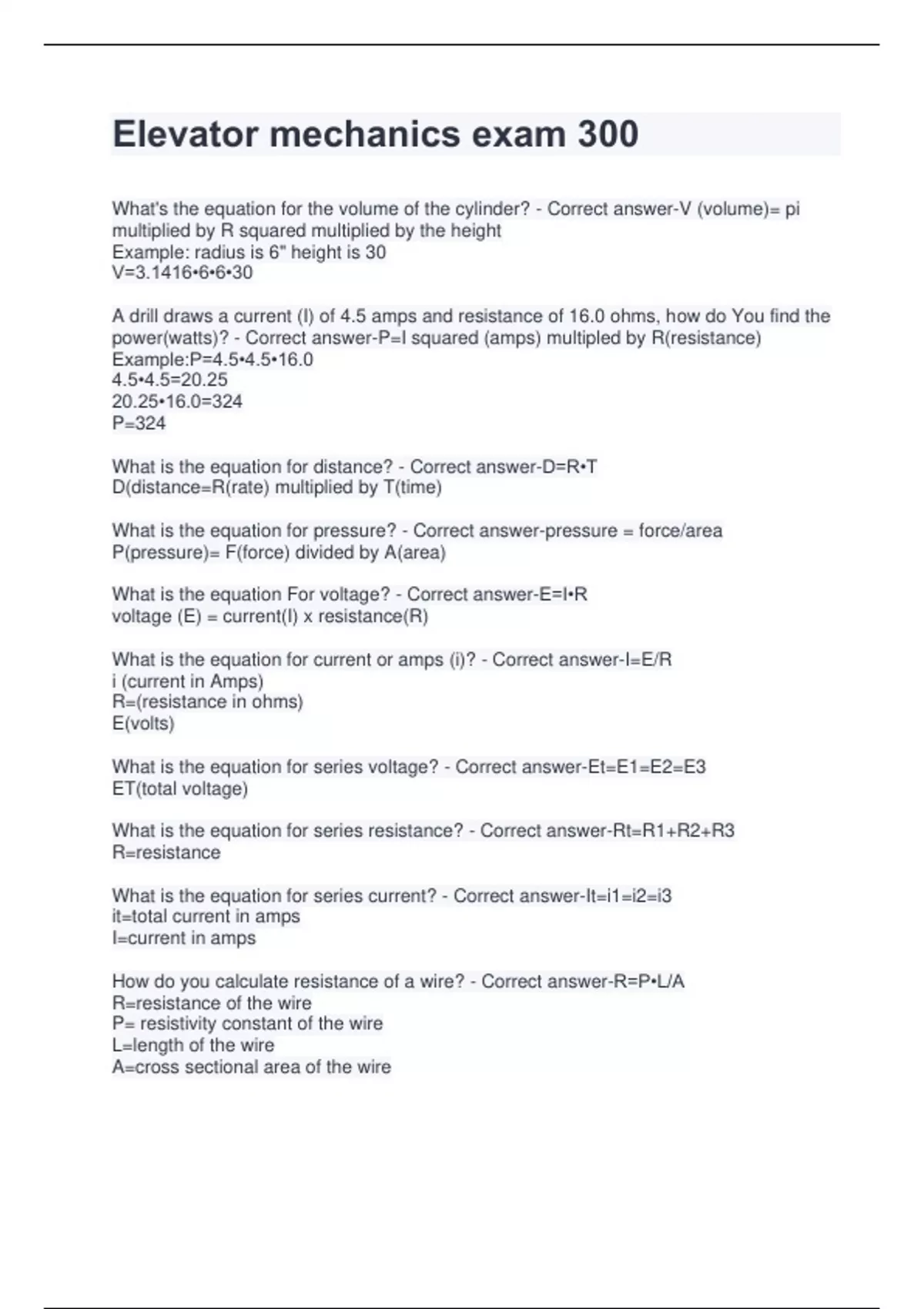 What's the equation for the volume of the cylinder? - Correct answer-V (volume)= pi multiplied by R squared multiplied by the height Example: radius is 6" height is 30 V=3.1416•6•6•30 A drill draws a current (I) of 4.5 amps and resistance of 16.0 ohms, how do You find the power(watts)? - Correct answer-P=I squared (amps) multipled by R(resistance) Example:P=4.5•4.5•16.0 4.5•4.5=20.25 20.25•16.0=324 P=324 What is the equation for distance? - Correct answer-D=R•T D(distance=R(rate) multiplied by T(time) What is the equation for pressure? - Correct answer-pressure = force/area P(pressure)= F(force) divided by A(area) What is the equation For voltage? - Correct answer-E=I•R voltage (E) = current(I) x resistance(R) What is the equation for current or amps (i)? - Correct answer-I=E/R i (current in Amps) R=(resistance in ohms) E(volts) What is the equation for series voltage? - Correct answer-Et=E1=E2=E3 ET(total voltage) What is the equation for series resistance? - Correct answer-Rt=R1+R2+R3 R=resistance What is the equation for series current? - Correct answer-It=i1=i2=i3 it=total current in amps I=current in amps How do you calculate resistance of a wire? - Correct answer-R=P•L/A R=resistance of the wire P= resistivity constant of the wire L=length of the wire A=cross sectional area of the wireWhat is the equation for parallel voltage? - Correct answer-Et=E1=E2=E3 E=voltage ET=total voltage What is the equation for parallel current? - Correct answer-iT=i1+i2+i3 I=current in amps iT=total current in amps What is the equation for parallel resistance? - Correct answer-RT= 1 divided by 1/R1 + 1/R2 +1/R3 Add each fraction (1/R1-1/R3) Divide the answer of each resistance by 1 **** What is the equation for pulley relationship? - Correct answer-(Diameter of First pulley) •(RPM of first pulley) (diameter of second pulley) •(RPM of second pulley) Take RPM of the first pulley and multiply it by the diameter of the first pulley, then divide that by the diameter of the second pulley. What is the equation for sprocket relationship ? - Correct answer-(Number of teeth in sprocket1)•(RPM of sprocket 1)= (number of teeth in sprocket 2)•(RPM of sprocket 2) Take the number of teeth and multiply it by the RPM, then divide it by the number of teeth in sprocket 2 What is the equation for leverage(lever principle)? - Correct answer-F1D1=F2D2 F1=weight to be lifted