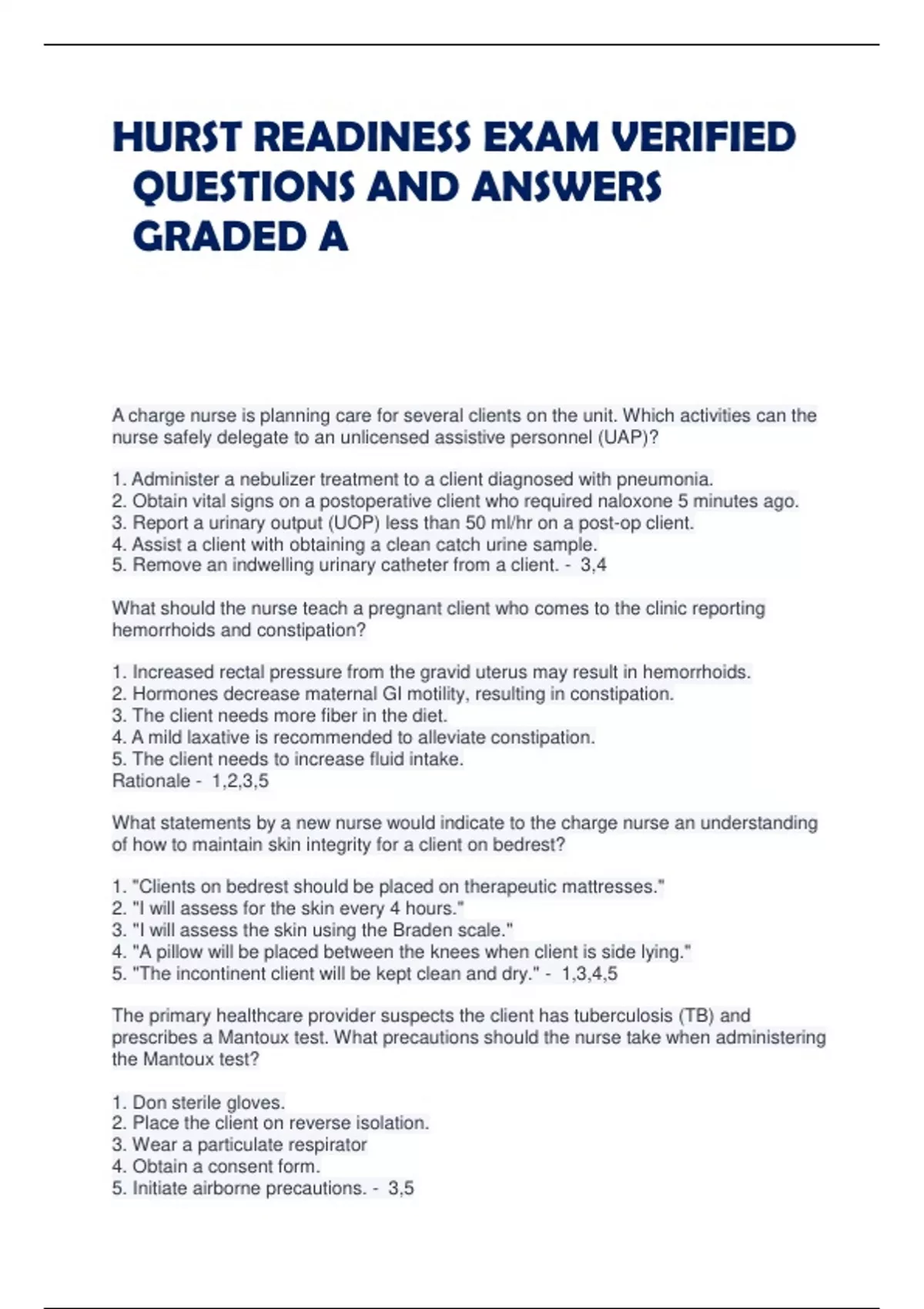 HURST READINESS EXAM VERIFIED QUESTIONS AND ANSWERS GRADED A A charge nurse is planning care for several clients on the unit. Which activities can the nurse safely delegate to an unlicensed assistive personnel (UAP)? 1. Administer a nebulizer treatment to a client diagnosed with pneumonia. 2. Obtain vital signs on a postoperative client who required naloxone 5 minutes ago. 3. Report a urinary output (UOP) less than 50 ml/hr on a post-op client. 4. Assist a client with obtaining a clean catch urine sample. 5. Remove an indwelling urinary catheter from a client. - 3,4 What should the nurse teach a pregnant client who comes to the clinic reporting hemorrhoids and constipation? 1. Increased rectal pressure from the gravid uterus may result in hemorrhoids. 2. Hormones decrease maternal GI motility, resulting in constipation. 3. The client needs more fiber in the diet. 4. A mild laxative is recommended to alleviate constipation. 5. The client needs to increase fluid intake. Rationale - 1,2,3,5 What statements by a new nurse would indicate to the charge nurse an understanding of how to maintain skin integrity for a client on bedrest? 1. "Clients on bedrest should be placed on therapeutic mattresses." 2. "I will assess for the skin every 4 hours." 3. "I will assess the skin using the Braden scale." 4. "A pillow will be placed between the knees when client is side lying." 5. "The incontinent client will be kept clean and dry." - 1,3,4,5 The primary healthcare provider suspects the client has tuberculosis (TB) and prescribes a Mantoux test. What precautions should the nurse take when administering the Mantoux test? 1. Don sterile gloves. 2. Place the client on reverse isolation. 3. Wear a particulate respirator 4. Obtain a consent form. 5. Initiate airborne precautions. - 3,5 Which finding should a nurse expect when assessing a healthy 65 year old client? 1. Anomia 2. Presbyopia 3. BP 156/88 4. Apraxia - 2 The charge nurse is evaluating knowledge of tracheostomy suctioning of a new nurse prior to that procedure being performed. Which statement by the new nurse would indicate to the charge nurse that additional education is needed? 1. "Prior to suctioning, I will hyper-oxygenate the client." 2. "I will instill normal saline bullets to liquefy secretions." 3. "I will allow at least 20 seconds between suctioning passes." 4. "Suctioning will be limited to a maximum of three catheter passes." - 2 The nurse observes a client at a follow-up appointment using correct cane walking technique but losing balance each time the quad cane is lifted off of the floor. The client reports a history of recent falls. What is the best action for the nurse to take? 1. Inform the primary healthcare provider of the observations made regarding quad cane use, and imbalance assessment. 2. Inform client that there are only a few assistive devices available to help with ambulation. 3. Instruct the client on proper quad cane use. 4. Notify the primary healthcare provider after consulting with the neighbor. - 1 The nurse is caring for a newly diagnosed diabetic in diabetic hyperosmolar hyperglycemic nonketotic (HHNK) state. What does the nurse anticipate the immediate treatment plan for this client will include? 1. NPH insulin. 2. Potassium 40 mEq (40 mmol/L) slow intravenous push. 3. Intravenous administration of isotonic saline. 4. Intravenous sodium bicarbonate. - 3 What is most important for the nurse to do prior to initiating peritoneal dialysis? 1. Aspirate for placement. 2. Have the client void. 3. Irrigate the catheter for patency. 4. Warm the dialysate fluid. - 4 The nurse in the outpatient clinic performs an assessment on a client who takes propranolol for management of palpitations associated with mitral valve prolapse. Which statement by the client should be reported immediately to the primary healthcare provider? 1. "My resting pulse was 60 this morning." 2. "I feel a little short of breath when walking." 3. "I have lost 5 pounds in the last 2 weeks." 4. "My blood pressure (BP) was lower this visit than last time." - 2 Blood and urine samples are sent to the laboratory for a client who has had a spinal cord injury. After reviewing these results, the nurse would expect which finding? Exhibit 1. Gross hematuria 2. Septicemia 3. Urinary tract infection 4. Anemia - 3 The nurse is instructing a client on achieving relaxation using deep breathing exercises. Which statement by the client indicates to the nurse that further teaching is necessary? 1. "I can perform deep breathing exercises anywhere and at any time that I feel tension and anxiety." 2. "I should sit or lie in a comfortable position, making sure my back is straight." 3. "I will inhale slowly and deeply through my mouth focusing on my chest expansion." 4. "When I have inhaled in as much as possible, I will hold my breath for a few seconds before exhaling." - 3 A client diagnosed with pancreatitis becomes increasingly restless, confused and has pulled out the NG tube and IV catheter. HR-128/min, BP 96/62. Oxygen saturation = 90%. Skin is cool and clammy to touch. Prioritize the actions that the nurse should take. Initiate oxygen. Insert another IV line. Obtain blood sugar level. Insert NG tube. Repeat vital sign checks - This is the correct order A teenage client is placed on life-support as a result of a motor vehicle accident (MVA). Following an electroencephalogram (EEG), the client has been declared brain dead. Which action by the nurse would take priority? 1. Call the respiratory department to have the ventilator removed. 2. Notify the facility's pastoral personnel. 3. Contact the regional organ procurement team. 4. Ask the family to select a funeral home. - 3 A child was diagnosed with attention-deficit/hyperactivity disorder (ADHD) in the clinic one week ago. Today the child's mother calls the clinic to tell the nurse, "My child has not been able to sleep since being put on methyphenidate." What is the best response for the nurse to make? 1. "I will discus
