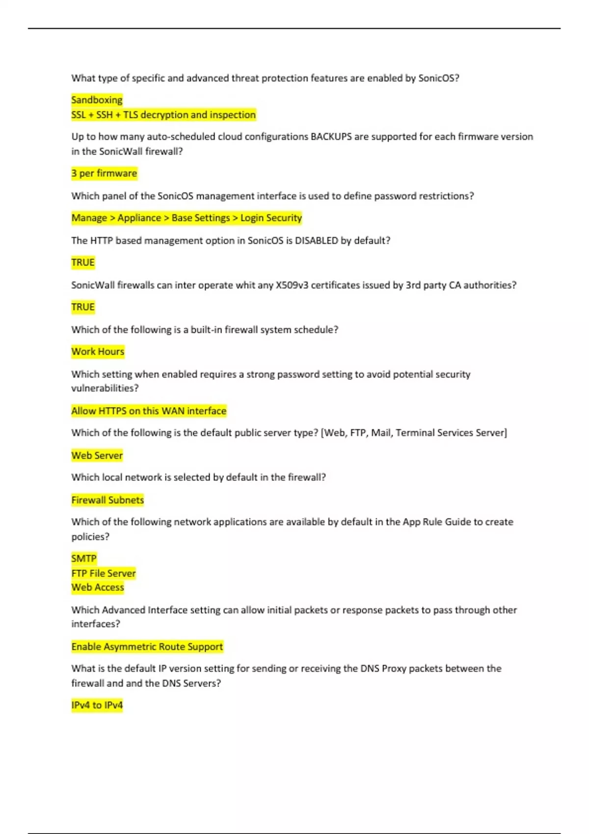 SonicWall%20Network%20Security%20Administrato What type of specific and advanced threat protection features are enabled by SonicOS? Sandboxing SSL + SSH + TLS decryption and inspection Up to how many auto-scheduled cloud configurations BACKUPS are supported for each firmware version in the SonicWall firewall? 3 per firmware Which panel of the SonicOS management interface is used to define password restrictions? Manage > Appliance > Base Settings > Login Security The HTTP based management option in SonicOS is DISABLED by default? TRUE SonicWall firewalls can inter operate whit any X509v3 certificates issued by 3rd party CA authorities? TRUE Which of the following is a built-in firewall system schedule? Work Hours Which setting when enabled requires a strong password setting to avoid potential security vulnerabilities? Allow HTTPS on this WAN interface Which of the following is the default public server type? [Web, FTP, Mail, Terminal Services Server] Web Server Which local network is selected by default in the firewall? Firewall Subnets Which of the following network applications are available by default in the App Rule Guide to create policies? SMTP FTP File Server Web Access Which Advanced Interface setting can allow initial packets or response packets to pass through other interfaces? Enable Asymmetric Route Support What is the default IP version setting for sending or receiving the DNS Proxy packets between the firewall and and the DNS Servers? IPv4 to IPv4 Which option is a messaging protocol that is used to build a cache of dynamic entries for IPv6 devices? Neighbor Discovery Which MAC-IP Anti-Spoof network setting prevents any spoofing of the egress packets by a bad device or unwanted ARP packets? ARP Lock What type of information does the DHCP server help distribute to network clients? IP Addresses Gateway Addresses DNS Server Settings Which of the following DDNS Providers are supported in SonicOS? changeIP.com Which user authentication method provides centralized authentication and authorization? RADIUS Which authentication method is recommended for a relatively smaller number of users? Local Users Which type of SSO method identifies users based on the workstation IP address? SSO Agent Which of the following types of privileges can an admin be assigned to? Full privileges (config or non-config) Read Only The default guest profile cannot be deleted? TRUE Which setting is enabled to prioritize VPN traffic over STATIC ROUTES? Allow VPN path to take precedence Which option is a common mechanism for preventing routing loops? Split Horizon Which feature is used to configure the event log attributes globally, using flexible match conditions? GO to CONFIGURE Log (on the right) Which feature; on the left panel; provides information about the applied filters? Filter Logic (bottom of the page) Which client CF event log depicts a higher priority level in the given image Client CF access without agent (CRITICAL) Which logging feature is used to create a predefined email notification with a defined subject? Automation Which monitoring panel displays the Firewall SNAPSHOT ? Dashboard The real-time data that is depicted on the dashboard is compiled and summarized from the "appflow" panel TRUE Which menu option depicts real-time data about the intrusions that have been blocked by the SonicWall security services ? Threat Protection