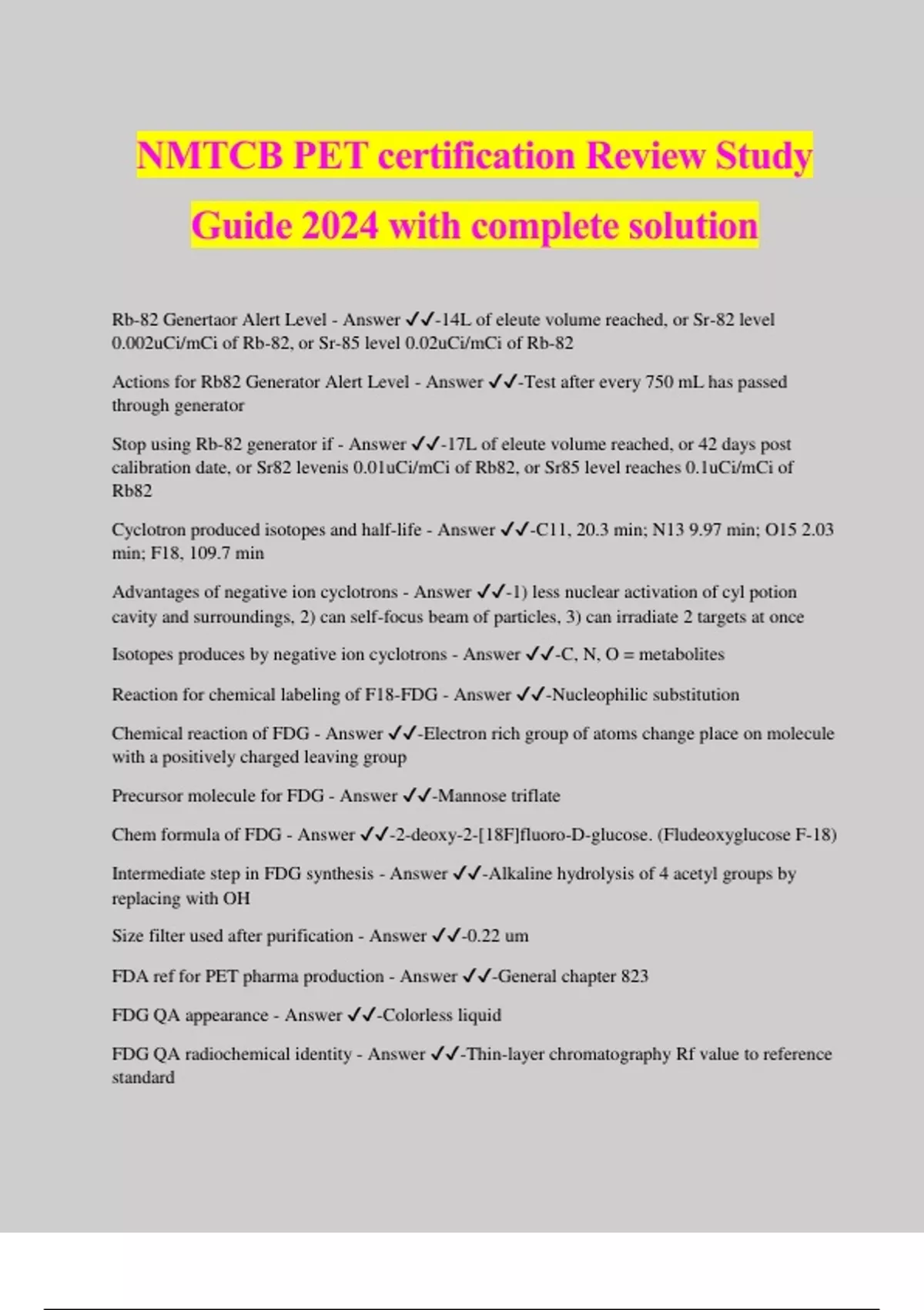 NMTCB PET certification Review Study Guide 2024 with complete solution Rb-82 Genertaor Alert Level - Answer ️️ -14L of eleute volume reached, or Sr-82 level 0.002uCi/mCi of Rb-82, or Sr-85 level 0.02uCi/mCi of Rb-82 Actions for Rb82 Generator Alert Level - Answer ️️ -Test after every 750 mL has passed through generator Stop using Rb-82 generator if - Answer ️️ -17L of eleute volume reached, or 42 days post calibration date, or Sr82 levenis 0.01uCi/mCi of Rb82, or Sr85 level reaches 0.1uCi/mCi of Rb82 Cyclotron produced isotopes and half-life - Answer ️️ -C11, 20.3 min; N13 9.97 min; O15 2.03 min; F18, 109.7 min Advantages of negative ion cyclotrons - Answer ️️ -1) less nuclear activation of cyl potion cavity and surroundings, 2) can self-focus beam of particles, 3) can irradiate 2 targets at once Isotopes produces by negative ion cyclotrons - Answer ️️ -C, N, O = metabolites Reaction for chemical labeling of F18-FDG - Answer ️️ -Nucleophilic substitution Chemical reaction of FDG - Answer ️️ -Electron rich group of atoms change place on molecule with a positively charged leaving group Precursor molecule for FDG - Answer ️️ -Mannose triflate Chem formula of FDG - Answer ️️ -2-deoxy-2-[18F]fluoro-D-glucose. (Fludeoxyglucose F-18) Intermediate step in FDG synthesis - Answer ️️ -Alkaline hydrolysis of 4 acetyl groups by replacing with OH Size filter used after purification - Answer ️️ -0.22 um FDA ref for PET pharma production - Answer ️️ -General chapter 823 FDG QA appearance - Answer ️️ -Colorless liquid FDG QA radiochemical identity - Answer ️️ -Thin-layer chromatography Rf value to reference standard FDG QARadionuclide identity - Answer ️️ -Half-life 105 and 115 minutes FDG QA bacterial endotoxins test - Answer ️️ -LAL (Limulus amebocyte lysate) <175 USP endotoxins units per max volume injection; endotoxins< 17.5 EU FDG QC pH - Answer ️️ -Between 4.5 to 7.5 FDG QA Radiochemical purity - Answer ️️ -Thin-layered chromatography radioactive Rf should be not less than 90% of total radioactivity of chromatography plate FDG QC Radionuclideic purity - Answer ️️ -should be >99.5% of radionuclidie specified. tested using multi-channel analyzer with peaks at 0.511 and 1.022 MeV FDG QC chemical purity - Answer ️️ -testing depends upon synthesis method used to create FDG Kryptofix 222 - Answer ️️ -FDG QC chemical purity test - thin-layer paper chromatography spot test. 50 ug/mL and FDG solution must dem