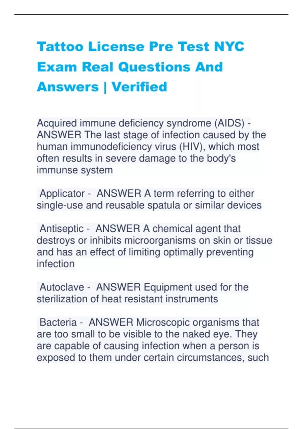 Tattoo License Pre Test NYC Exam Real Questions And Answers | Verified Acquired immune deficiency syndrome (AIDS) - ANSWER The last stage of infection caused by the human immunodeficiency virus (HIV), which most often results in severe damage to the body's immunse system Applicator - ANSWER A term referring to either single-use and reusable spatula or similar devices Antiseptic - ANSWER A chemical agent that destroys or inhibits microorganisms on skin or tissue and has an effect of limiting optimally preventing infection Autoclave - ANSWER Equipment used for the sterilization of heat resistant instruments Bacteria - ANSWER Microscopic organisms that are too small to be visible to the naked eye. They are capable of causing infection when a person is exposed to them under certain circumstances, such as through abraded skin (eg. staphylococci, streptococci) Bacterial Spores - ANSWER Some microorganisms are able to survive in very harsh conditions by enveloping themselves with this thick wall. They make bacteria highly resistant to killing. If they are introduced to the body where conditions become more favorable—when there's more water or more food available—the bacteria "come to life" again, transforming from a spore back to a vegetative cell that can cause serious infection. They can be destroyed by sterilization only Blood borne infections - ANSWER Infections caused by viruses found in the blood such as hepatitis B virus (HBV), hepatitis C virus (HCV), or human immunodeficiency virus (HIV) Body Fluids - ANSWER Fluids normally present in the body such as blood, mucous, sweat, oil, saliva, urine, ooze from a festering sore, or tears. They may contain infectious organisms. Cleaning - ANSWER Refers to the process of removing blood, other body fluids, organic material, tissue, and dirt from the surface of an object by scrubbing with a brush, detergent and water. It greatly reduces the number of microorganisms (including bacterial endospores) on items and is a crucial step in processing. If items haven't first been cleaned, further processing might not be effective. Contamination - ANSWER A disinfected or sterile item or surface that becomes soiled with microorganisms Cross-contamination - ANSWER The transfer of microorganisms from one surface to another or from something contaminated to something clean or sterileTattoo License Pre Test NYC Exam Real Questions And Answers | Verified Acquired immune deficiency syndrome (AIDS) - ANSWER The last stage of infection caused by the human immunodeficiency virus (HIV), which most often results in severe damage to the body's immunse system Applicator - ANSWER A term referring to either single-use and reusable spatula or similar devices Antiseptic - ANSWER A chemical agent that destroys or inhibits microorganisms on skin or tissue and has an effect of limiting optimally preventing infection Autoclave - ANSWER Equipment used for the sterilization of heat resistant instruments Bacteria - ANSWER Microscopic organisms that are too small to be visible to the naked eye. They are capable of causing infection when a person is exposed to them under certain circumstances, such as through abraded skin (eg. staphylococci, streptococci) Bacterial Spores - ANSWER Some microorganisms are able to survive in very harsh conditions by enveloping themselves with this thick wall. They make bacteria highly resistant to killing. If they are introduced to the body where conditions become more favorable—when there's more water or more food available—the bacteria "come to life" again, transforming from a spore back to a vegetative cell that can cause serious infection. They can be destroyed by sterilization only Blood borne infections - ANSWER Infections caused by viruses found in the blood such as hepatitis B virus (HBV), hepatitis C virus (HCV), or human immunodeficiency virus (HIV) Body Fluids - ANSWER Fluids normally present in the body such as blood, mucous, sweat, oil, saliva, urine, ooze from a festering sore, or tears. They may contain infectious organisms. Cleaning - ANSWER Refers to the process of removing blood, other body fluids, organic material, tissue, and dirt from the surface of an object by scrubbing with a brush, detergent and water. It greatly reduces the number of microorganisms (including bacterial endospores) on items and is a crucial step in processing. If items haven't first been cleaned, further processing might not be effective. Contamination - ANSWER A disinfected or sterile item or surface that becomes soiled with microorganisms Cross-contamination - ANSWER The transfer of microorganisms from one surface to another or from something contaminated to something clean or sterile