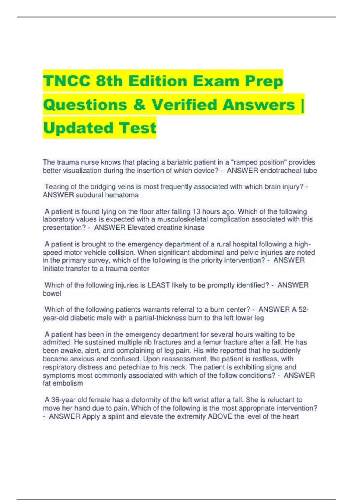 TNCC 8th Edition Exam Prep Questions & Verified Answers | Updated Test The trauma nurse knows that placing a bariatric patient in a "ramped position" provides better visualization during the insertion of which device? - ANSWER endotracheal tube Tearing of the bridging veins is most frequently associated with which brain injury? - ANSWER subdural hematoma A patient is found lying on the floor after falling 13 hours ago. Which of the following laboratory values is expected with a musculoskeletal complication associated with this presentation? - ANSWER Elevated creatine kinase A patient is brought to the emergency department of a rural hospital following a highspeed motor vehicle collision. When significant abdominal and pelvic injuries are noted in the primary survey, which of the following is the priority intervention? - ANSWER Initiate transfer to a trauma center Which of the following injuries is LEAST likely to be promptly identified? - ANSWER bowel Which of the following patients warrants referral to a burn center? - ANSWER A 52- year-old diabetic male with a partial-thickness burn to the left lower leg A patient has been in the emergency department for several hours waiting to be admitted. He sustained multiple rib fractures and a femur fracture after a fall. He has been awake, alert, and complaining of leg pain. His wife reported that he suddenly became anxious and confused. Upon reassessment, the patient is restless, with respiratory distress and petechiae to his neck. The patient is exhibiting signs and symptoms most commonly associated with which of the follow conditions? - ANSWER fat embolism A 36-year old female has a deformity of the left wrist after a fall. She is reluctant to move her hand due to pain. Which of the following is the most appropriate intervention? - ANSWER Apply a splint and elevate the extremity ABOVE the level of the heart A 56-year-old male patient involved in a motor vehicle crash is brought to the emergency department of a rural critical assess facility. He complaints of neck pain, shortness of breath, and diffuse abdominal pain. His Glasgow Coma Score is 15. His vital signs are as follows: BP 98/71 mm Hg, HR 125 beats/minute, RR 26 breaths/minute, SpO2 94% on high-flow oxygen via non-rebreather mask. Which of the follow is the priority intervention for this patient? - ANSWER Expedite transfer to the closest trauma center Which of the following values indicates the need for alcohol withdrawal interventions? - ANSWER CIWA-Ar of 36 A trauma patient is en route to a rural emergency department. Radiology notifies the charge nurse that the computed tomography (CT) scanner will be out of service for several hours. The team gathers to plan accordingly. Which of the following terms best describes this trauma team's communication? - ANSWER huddle A patient with a complete spinal cord injury in neurogenic shock will demonstrate hypotension and which other clinical signs? - ANSWER Bradycardia and absent motor function below the level of injury Which of the following is true about the log-roll maneuver? - ANSWER It can worsen cord damage from a unstable spinal injury What factor contributes most to the kinetic energy of a body in motion? - ANSWER velocity A 5-year-old child presents to the ED with bruises to the upper arms and buttocks in various stages of healing and multiple small, clean, round burns to the back. There are no abnormalities found based on the pediatric assessment triangle or primary survey. Which of the following is the priority nursing intervention? - ANSWER Report your suspicion of maltreatment in accordance with local regulations