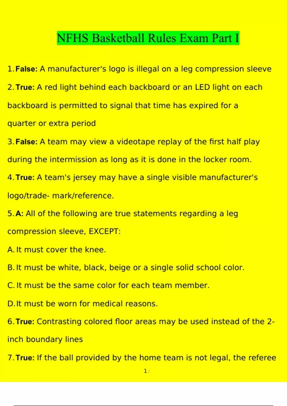 NFHS Basketball Rules Exam Part I Questions & Answers 2023/2024