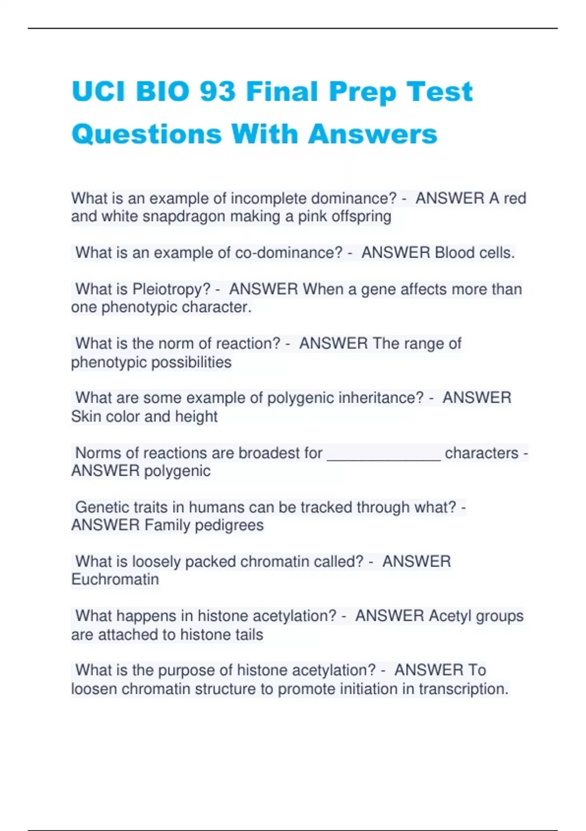 UCI BIO 93 Final Prep Test Questions With Answers What is an example of incomplete dominance? - ANSWER A red and white snapdragon making a pink offspring What is an example of co-dominance? - ANSWER Blood cells. What is Pleiotropy? - ANSWER When a gene affects more than one phenotypic character. What is the norm of reaction? - ANSWER The range of phenotypic possibilities What are some example of polygenic inheritance? - ANSWER Skin color and height Norms of reactions are broadest for _____________ characters - ANSWER polygenic Genetic traits in humans can be tracked through what? - ANSWER Family pedigrees What is loosely packed chromatin called? - ANSWER Euchromatin What happens in histone acetylation? - ANSWER Acetyl groups are attached to histone tails What is the purpose of histone acetylation? - ANSWER To loosen chromatin structure to promote initiation in transcription. In what gender is Igf2 expressed in? - ANSWER The maternal chromosome What does it mean for a protein to be ubiquitinated? - ANSWER Ubiquitin attached to the protein and takes it to a proteasome that degrades the protein. What does a repressor do? - ANSWER Block transcription of a gene What does an activator do? - ANSWER Stimulate the transcription of a gene What binds to the enhancers? - ANSWER The activators What are some ways that mRNA can be degraded? - ANSWER shortening of poly A tail, removal of cap, nucleases chew up mRNA What are histones responsible for? - ANSWER 1st level of DNA packing in chromatin What is a region of highly condensed chromatin called? - ANSWER Heterochromatin