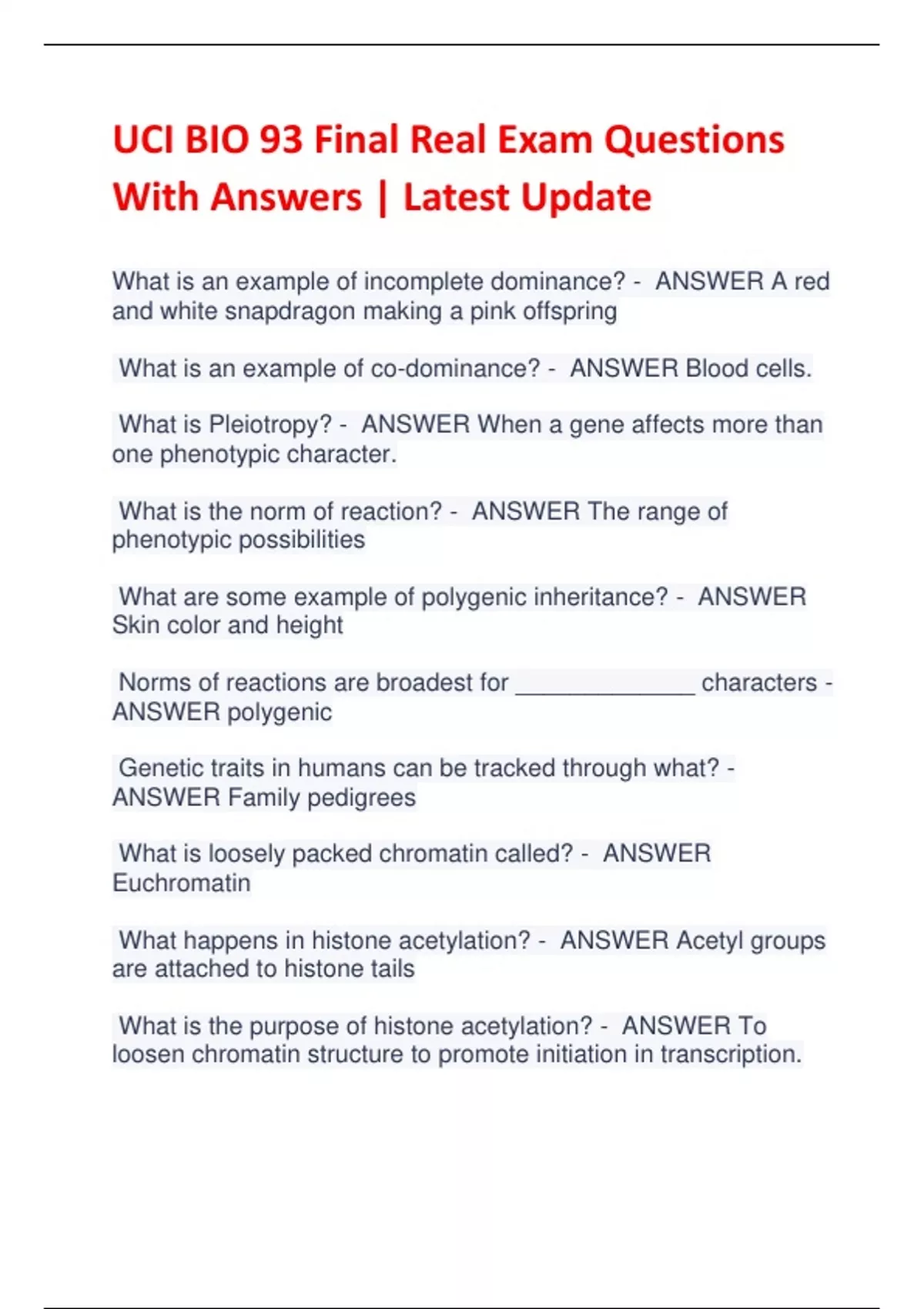 UCI BIO 93 Final Real Exam Questions With Answers | Latest Update What is an example of incomplete dominance? - ANSWER A red and white snapdragon making a pink offspring What is an example of co-dominance? - ANSWER Blood cells. What is Pleiotropy? - ANSWER When a gene affects more than one phenotypic character. What is the norm of reaction? - ANSWER The range of phenotypic possibilities What are some example of polygenic inheritance? - ANSWER Skin color and height Norms of reactions are broadest for _____________ characters - ANSWER polygenic Genetic traits in humans can be tracked through what? - ANSWER Family pedigrees What is loosely packed chromatin called? - ANSWER Euchromatin What happens in histone acetylation? - ANSWER Acetyl groups are attached to histone tails What is the purpose of histone acetylation? - ANSWER To loosen chromatin structure to promote initiation in transcription. In what gender is Igf2 expressed in? - ANSWER The maternal chromosome What does it mean for a protein to be ubiquitinated? - ANSWER Ubiquitin attached to the protein and takes it to a proteasome that degrades the protein. What does a repressor do? - ANSWER Block transcription of a gene What does an activator do? - ANSWER Stimulate the transcription of a gene What binds to the enhancers? - ANSWER The activators What are some ways that mRNA can be degraded? - ANSWER shortening of poly A tail, removal of cap, nucleases chew up mRNA
