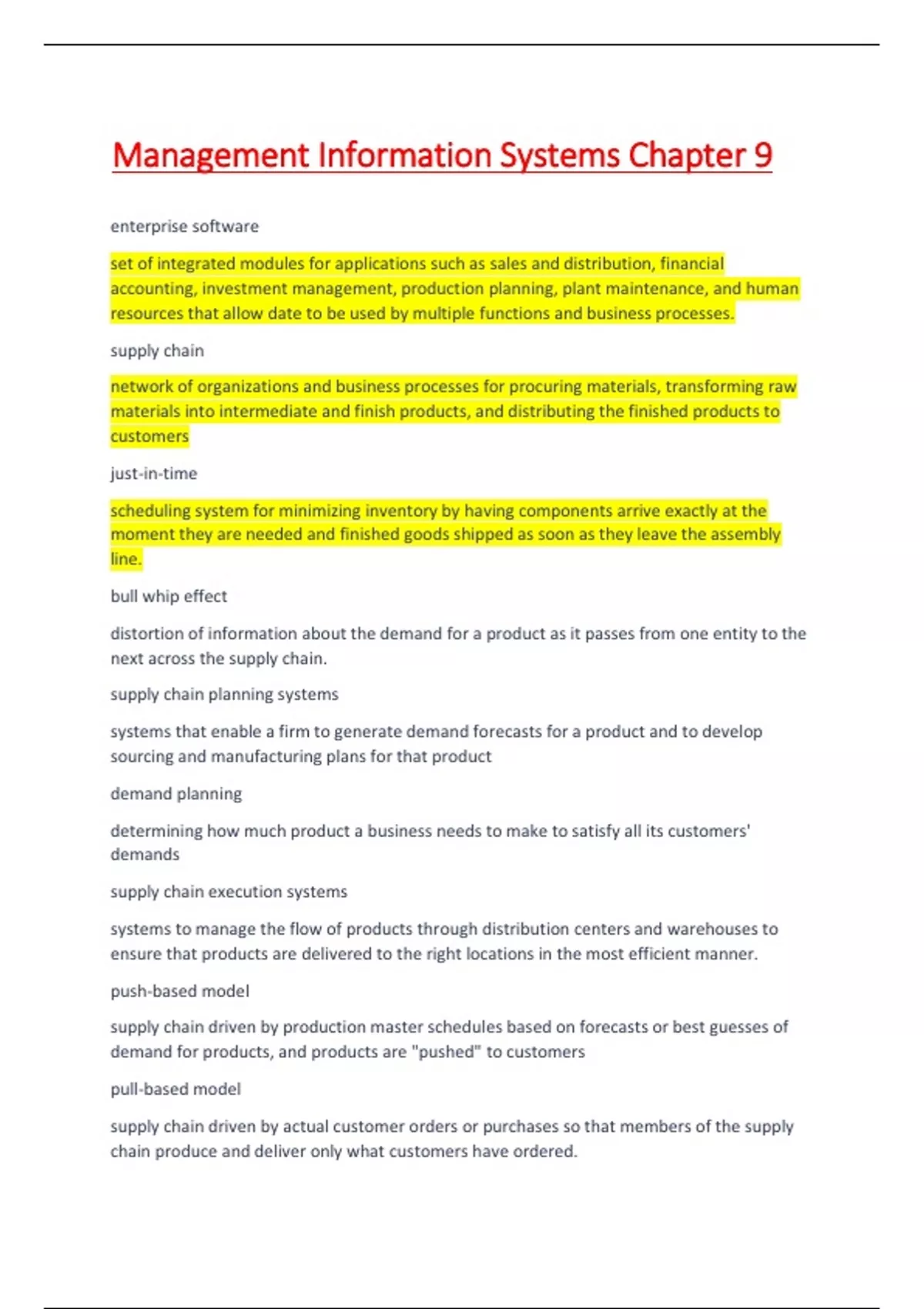 supply chain network of organizations and business processes for procuring materials, transforming raw materials into intermediate and finish products, and distributing the finished products to customers just-in-time scheduling system for minimizing inventory by having components arrive exactly at the moment they are needed and finished goods shipped as soon as they leave the assembly line. bull whip effect distortion of information about the demand for a product as it passes from one entity to the next across the supply chain. supply chain planning systems systems that enable a firm to generate demand forecasts for a product and to develop sourcing and manufacturing plans for that product demand planning determining how much product a business needs to make to satisfy all its customers' demands supply chain execution systems systems to manage the flow of products through distribution centers and warehouses to ensure that products are delivered to the right locations in the most efficient manner. push-based model supply chain driven by production master schedules based on forecasts or best guesses of demand for products, and products are "pushed" to customers pull-based model supply chain driven by actual customer orders or purchases so that members of the supply chain produce and deliver only what customers have ordered.