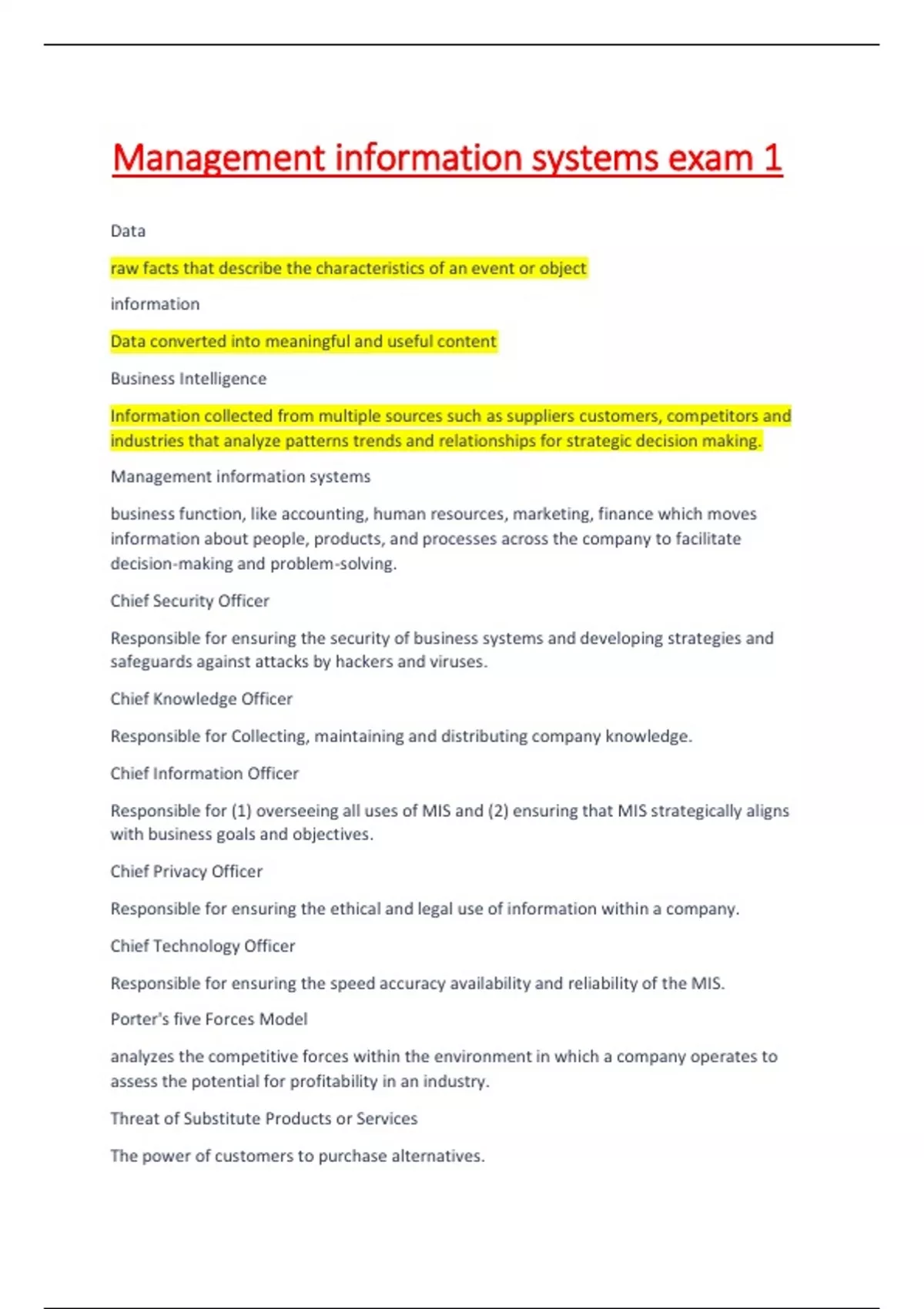Information collected from multiple sources such as suppliers customers, competitors and industries that analyze patterns trends and relationships for strategic decision making. Management information systems business function, like accounting, human resources, marketing, finance which moves information about people, products, and processes across the company to facilitate decision-making and problem-solving. Chief Security Officer Responsible for ensuring the security of business systems and developing strategies and safeguards against attacks by hackers and viruses. Chief Knowledge Officer Responsible for Collecting, maintaining and distributing company knowledge. Chief Information Officer Responsible for (1) overseeing all uses of MIS and (2) ensuring that MIS strategically aligns with business goals and objectives. Chief Privacy Officer Responsible for ensuring the ethical and legal use of information within a company. Chief Technology Officer Responsible for ensuring the speed accuracy availability and reliability of the MIS. Porter's five Forces Model analyzes the competitive forces within the environment in which a company operates to assess the potential for profitability in an industry. Threat of Substitute Products or Services The power of customers to purchase alternatives.