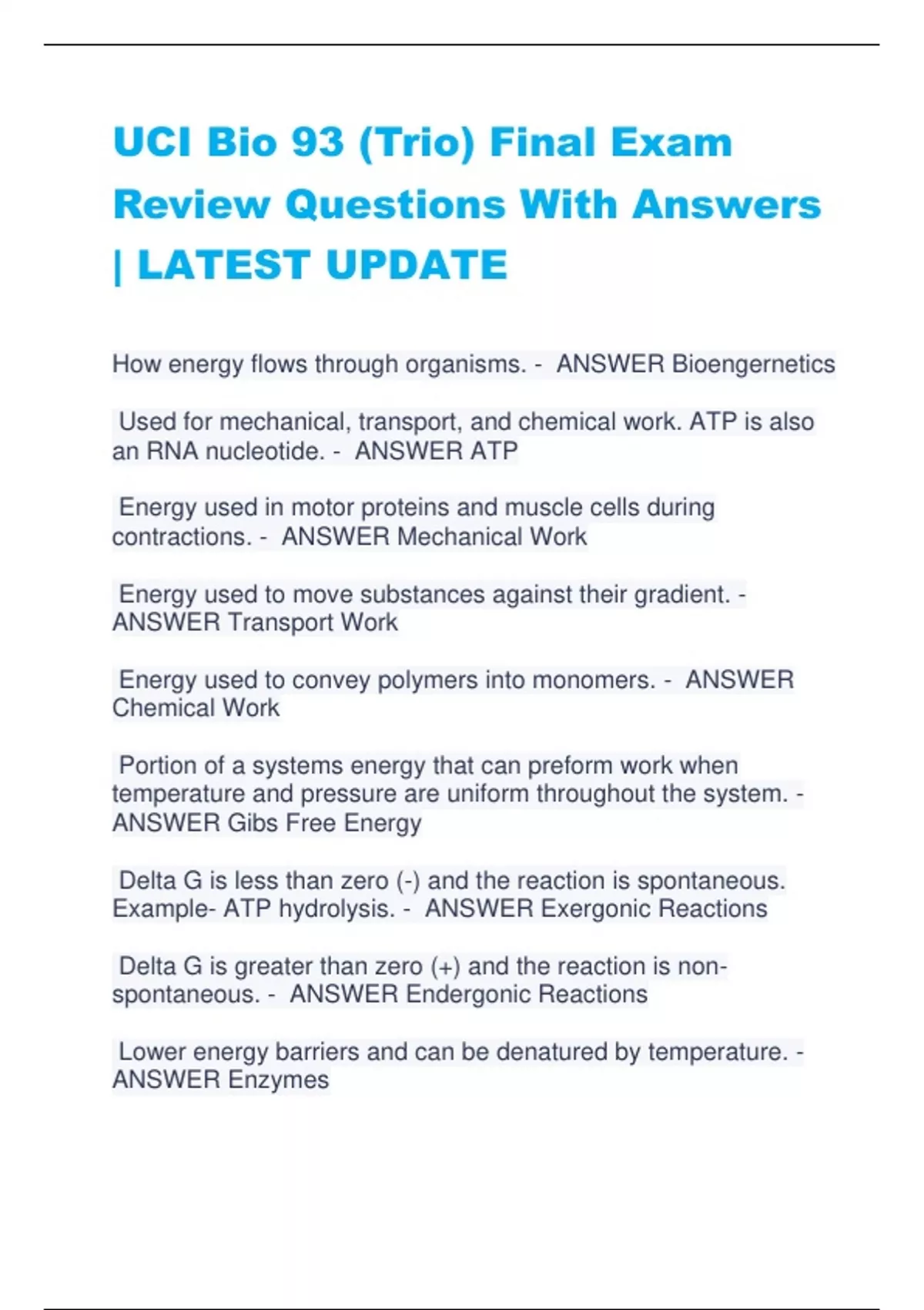 UCI Bio 93 (Trio) Final Exam Review Questions With Answers | LATEST UPDATE How energy flows through organisms. - ANSWER Bioengernetics Used for mechanical, transport, and chemical work. ATP is also an RNA nucleotide. - ANSWER ATP Energy used in motor proteins and muscle cells during contractions. - ANSWER Mechanical Work Energy used to move substances against their gradient. - ANSWER Transport Work Energy used to convey polymers into monomers. - ANSWER Chemical Work Portion of a systems energy that can preform work when temperature and pressure are uniform throughout the system. - ANSWER Gibs Free Energy Delta G is less than zero (-) and the reaction is spontaneous. Example- ATP hydrolysis. - ANSWER Exergonic Reactions Delta G is greater than zero (+) and the reaction is nonspontaneous. - ANSWER Endergonic Reactions Lower energy barriers and can be denatured by temperature. - ANSWER Enzymes Phrase used to describe the very specific nature of enzymesubstrate interactions. - ANSWER "Lock and Key" Energy is constant and cannot be created or destroyed. - ANSWER 1st Law of Thermodynamics Every energy transformation increases the entropy in the universe. - ANSWER 2nd Law of Thermodynamics Process used by heterotrophs. Occurs in the mitochondria and produces majority of the energy our body constantly uses. - ANSWER Cellular Respiration Leads to cancer and aging, as well as muscle and metabolic dysfunction. - ANSWER Mitochondrial Defects Loss of electrons. - ANSWER Oxidation Addition of electrons. - ANSWER Reduction Activation Energy. - ANSWER What prevents glucose from instantly combining with oxygen? Occurs in the cytosol. The process of breaking down the 6 carbon molecule, glucose, into two 3 carbon pyruvate. The breaking of this bond creates 2 ATP. Does not require oxygen. NAD+, 1 Glucose, and 2 ATP go in while 2 pyruvate, NADH, and 4 ATP come out. - ANSWER Glycolysis Generation of ATP and ADP from a phosphorylated substrate. - ANSWER Substrate-Level Phosphorylation A process which does not require the input of oxygen. (Ie fermentation) - ANSWER Anaerobic A process which requires the input of oxygen. - ANSWER Aerobic A 3 carbon molecule that is made from the hydrolysis of glucose. - ANSWER Pyruvate Occurs in the matrix of the mitochondria. Pyruvate (3 carbon) and NADH+ go in while Acetyl CoA and NADH come out. - ANSWER Pyruvate Oxidation Occurs in the matrix of the mitochondria. Acetyl CoA (2 Carbon), NAD+/FAD+, and ADP go in while CO2 (1 Carbon), NADH/FADH2, and ATP come out. - ANSWER Citric Acid Cycle (Kreb's Cycle) Occurs in the inner membrane of the mitochondria. NADH and FADH2 carry electron through the transport chain and pump protons against their gradient (chemiosmosis). Oxidative Phosphorylation produces around 34 ATP through ATP synthase. - ANSWER Electron Transport Chain or Oxidative Phosphorylation