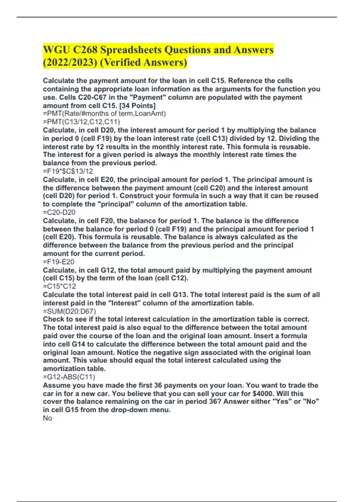 WGU C268 Spreadsheets Questions and Answers (2022/2023) (Verified Answers) Calculate the payment amount for the loan in cell C15. Reference the cells containing the appropriate loan information as the arguments for the function you use. Cells C20-C67 in the "Payment" column are populated with the payment amount from cell C15. [34 Points] =PMT(Rate/#months of term,LoanAmt) =PMT(C13/12,C12,C11) Calculate, in cell D20, the interest amount for period 1 by multiplying the balance in period 0 (cell F19) by the loan interest rate (cell C13) divided by 12. Dividing the interest rate by 12 results in the monthly interest rate. This formula is reusable. The interest for a given period is always the monthly interest rate times the balance from the previous period. =F19*$C$13/12 Calculate, in cell E20, the principal amount for period 1. The principal amount is the difference between the payment amount (cell C20) and the interest amount (cell D20) for period 1. Construct your formula in such a way that it can be reused to complete the "principal" column of the amortization table. =C20-D20 Calculate, in cell F20, the balance for period 1. The balance is the difference between the balance for period 0 (cell F19) and the principal amount for period 1 (cell E20). This formula is reusable. The balance is always calculated as the difference between the balance from the previous period and the principal amount for the current period. =F19-E20 Calculate, in cell G12, the total amount paid by multiplying the payment amount (cell C15) by the term of the loan (cell C12). =C15*C12 Calculate the total interest paid in cell G13. The total interest paid is the sum of all interest paid in the "Interest" column of the amortization table. =SUM(D20:D67) Check to see if the total interest calculation in the amortization table is correct. The total interest paid is also equal to the difference between the total amount paid over the course of the loan and the original loan amount. Insert a formula into cell G14 to calculate the difference between the total amount paid and the original loan amount. Notice the negative sign associated with the original loan amount. This value should equal the total interest calculated using the amortization table. =G12-ABS(C11) Assume you have made the first 36 payments on your loan. You want to trade the car in for a new car. You believe that you can sell your car for $4000. Will this cover the balance remaining on the car in period 36? Answer either "Yes" or "No" in cell G15 from the drop-down menu. No Use the HLOOKUP function to complete the "Hourly Wage" column of table 1. Use the "Employee" column of table 1 as the lookup_value and the "Employee Wage Information" above table 1 as your reference table. =HLOOKUP(D16,$E$11:$H$12,2,FALSE) Use the AND function to complete the "Time Bonus?" column of table 1. An employee earns a time bonus if the project's "Hours Worked" are fewer than the "Estimated Hours" and if the work "Quality" is greater than 1. =AND(E16<C16,H16>1) Use the OR function to complete the "Outcome Bonus?" column of table 1. An employee earns an outcome bonus if the difficulty of a job is greater than 3 or if the quality of their work is equal to 3. =OR(G16>3,H16=3) Use the IF function to complete the "Time Bonus $" column of table 1. If an employee earns a time bonus (i.e., the corresponding cell in the "Time Bonus?" column is TRUE), then "Time Bonus $" is the "Job Pay" for that project times the bonus percentage in cell M11. Otherwise "Time Bonus $" is 0. =IF(I16,K16*$M$11,0) Use the IF function to complete the "Outcome Bonus $" column of table 1. If an employee earns an outcome bonus (i.e., the corresponding cell in the "Outcome Bonus?" column is TRUE), then "Outcome Bonus $" is the "Job Pay" for that project times the outcome bonus percentage in cell M12; otherwise, "Outcome Bonus $" is 0. =IF(J16,K16*$M$12,0) Use the IF function to complete the "Comments" column of table 1. Display "Good Job" if both the "Hours Worked" are less than or equal to the "Estimated Hours" for a project and the assessed "Quality" of that project is greater than 1. Display "Too Much Time" if the "Hours Worked" on a project exceed the "Estimated Hours" for that project; otherwise, display "Poor Quality." =IF(AND(E16<=C16,H16>1),"Good Job",IF(E16>C16,"Too Much time","Poor Quality")) Use the VLOOKUP function to complete the "Employee" column of table 2. Use "Job ID" from table 2 as your lookup_value(s) and table 1 as the reference table. =VLOOKUP(B40,$B$16:$O$35,3,FALSE) Use the VLOOKUP function to complete the "Difficulty" column of table 2. Again, use "Job ID" from table 2 as the lookup_value(s) and table 1 as the reference table. =VLOOKUP(B40,$B$16:$O$35,6,FALSE) Use the COUNTIF function to complete the "# of Jobs" column in table 3. Reference the appropriate field in table 1 as your range and the "Employee" names in table 3 as your criteria. =COUNTIF($D$16:$D$35,G39) Use the SUMIF function to complete the "Total Hours" column in table 3. Reference the appropriate field in table 1 as your range and the "Employee" names in table 3 as your criteria. =SUMIF($D$16:$D$35,G39,$E$16:$E$35) Use the SUMIF function to complete the "Total Pay" column in table 3. Reference the "Employee" field in table 1 as your range, the "Employee" names in table 3 as your criteria, and the "Total Pay" field in table 1 as your sum_range. =SUMIF($D$16:$D$35,G39,$N$16:$N$35) Use the COUNTIF function to complete the "# of Touch-ups" column in table 4. Reference the appropriate field in table 2 as your range and the "Difficulty" rating in table 4 as your criteria. =COUNTIF($D$40:$D$46,G46) Use the SUMIF function to complete the "Cost Touch-ups" column in table 4. Reference the appropriate field in table 2 as your range and the "Difficulty" rating in table 4 as your criteria. =SUMIF($D$40:$D$46,G46,$E$40:$E$46) Use the AVERAGEIF function to complete the "Average Hours/Job" column in table 4. Reference the appropriate field in