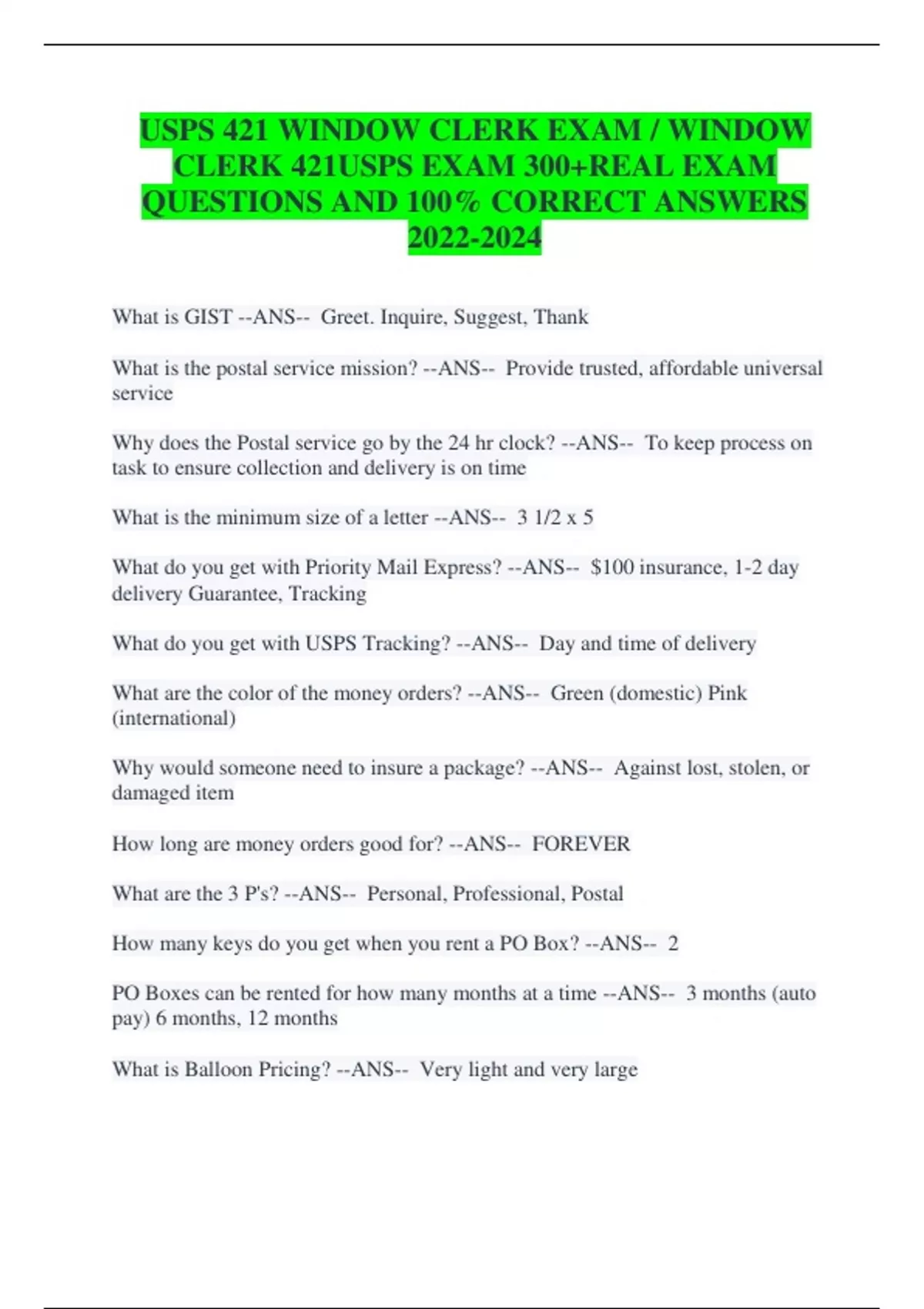 USPS 421 WINDOW CLERK EXAM / WINDOW CLERK 421USPS EXAM 300+REAL EXAM QUESTIONS AND 100% CORRECT ANSWERS What is GIST --ANS-- Greet. Inquire, Suggest, Thank What is the postal service mission? --ANS-- Provide trusted, affordable universal service Why does the Postal service go by the 24 hr clock? --ANS-- To keep process on task to ensure collection and delivery is on time What is the minimum size of a letter --ANS-- 3 1/2 x 5 What do you get with Priority Mail Express? --ANS-- $100 insurance, 1-2 day delivery Guarantee, Tracking What do you get with USPS Tracking? --ANS-- Day and time of delivery What are the color of the money orders? --ANS-- Green (domestic) Pink (international) Why would someone need to insure a package? --ANS-- Against lost, stolen, or damaged item How long are money orders good for? --ANS-- FOREVER What are the 3 P's? --ANS-- Personal, Professional, Postal How many keys do you get when you rent a PO Box? --ANS-- 2 PO Boxes can be rented for how many months at a time --ANS-- 3 months (auto pay) 6 months, 12 months What is Balloon Pricing? --ANS-- Very light and very large What are the characteristics for Dimensional Weight Pricing --ANS-- Priority, Zone 5-8 and is more than a Cubic foot What is a IRC (International Reply Coupon)? --ANS-- a prepaid coupon use to purchase stamp equivalent of current postage rate to other country What would certified mail be used for? --ANS-- Important documents such as taxes, court documents. What is restricted delivery? --ANS-- when you needed a specific person to sign for item When do you need to fill out a 8105A? --ANS-- for money orders purchases in $3000 or more and cashing of $10, 000 in a single day When would you fill out a 8105B --ANS-- when a suspicious transaction has taken place What kind of payment can the Post office take? --ANS-- Cash, credit/debit cards, money orders, travelers checks, checks (personal and business) What can you not purchase with a credit card? --ANS-- Money orders, payment to DOS for passports employee debt, trust funds, etc What is the Max per Domestic money order? --ANS-- $1000 What it the Max per International money order? --ANS-- Up to $700 What are some trigger words? --ANS-- you need to.. its not my problem, I cant/wont What are some calming words? --ANS-- I'm sorry... that sounds so frustrating, let me help What is oversized pricing? --ANS-- Big and Heavy What is the Max weight the Post office will accept? --ANS-- 70 lbs How many bait money orders do you have? --ANS-- 3 Why do you have bait money orders? --ANS-- to help aid in investigation to help USPIS Where would I go to find out if I can mail a fur coat to China? --ANS-- IMM (international Mail Manual) Where do you keep your bait money orders? --ANS-- Under your largest bills in your till What is an irregular sized package? --ANS-- tube, film photo mailer What is the DMM used for? --ANS-- Dom Mail Manual to see how to mail something in the US How often is the Retail digest published --ANS-- bi-weekly Where would I go to find out how to hang the POW flag --ANS-- Postal bulletin Why would someone want to use Signature Confirmation? --ANS-- For added security to insure item is signed when received How often do you need to do your 1412 (end of day report) --ANS-- daily and sign with ink What is Premium Forward service? --ANS-- When a customer is mailed weekly via priority mail all of their mail for a fee How long is a permanent forward kept on file? --ANS-- 18 months How much insurance can you purchase? --ANS-- up to $5000 How many forms of ID do you need to rent a PO Box? --ANS-- 2 - One photo and one with proof of address How long can you hold your mail for? --ANS-- min of 3 days no more than 30 If your in a market dominant area, do you pay a deposit for your PO Box keys? -- ANS-- Yes How many day do you have to verify info on a new PO Box rental --ANS-- 3 days When do you issue a 2nd/Final notice on a certified item? --ANS-- 5 days When do you return an unclaimed certified item --ANS-- 15 days How much cash are you accountable for in your drawer? --ANS-- $100 How much are you allowed to be short in your drawer --ANS-- $10 or 10% How often is your drawer audited --ANS-- quarterly Can you share your drawer? --ANS-- NO What is anonymous mail? --ANS-- mail that bears postage stamps, weighs over 13 oz and is not presented to a retail clerk What is identifiable mail --ANS-- mail that has been click and ship, Metered permit imprint What is EDDM (every door direct mail) --ANS-- 5000 pieces or less to be delivered to every house/mail box how much cash back can you get? --ANS-- $50 in increments of $10 What is special handling --ANS-- used for bees and poultry (baby chicks) What is package interception? --ANS-- recalling or redirecting a trackable package what is the benefit of retail equipment? --ANS-- multiple transaction, running tally, less mathematical errors How often do the retail floor get restocked --ANS-- 2 a week what is a firm hold out? --ANS-- business that received 50 plus letters daily, set up and cancelled by postmaster what is a certificate of mailing --ANS-- proof of mailing Who would want to use Registered Mail --ANS-- someone mailing something of high value Up to what amount can a registered item be insured for? --ANS-- $25000 What is RCE (retail customer experience) used for --ANS-- To take a snap shot of the transaction/customer experience to improve our brand. What do you get with Priority mail --ANS-- 2-3 day delivery, $50 free insurance and tracking Can you write a check for over the amount of purchase? --ANS-- no If you rent a PO box on the 16th of July when is your 6 month renewal due again? --ANS-- January When will you box be closed and mail returned --ANS-- 11th day when will the first renewal notice be put in the box? --ANS-- First of that month when will webbats generate a reminder notice be place in a box --ANS-- 20th What are some additional services that the post office offers --ANS-- Selective Services, Passports, Duc