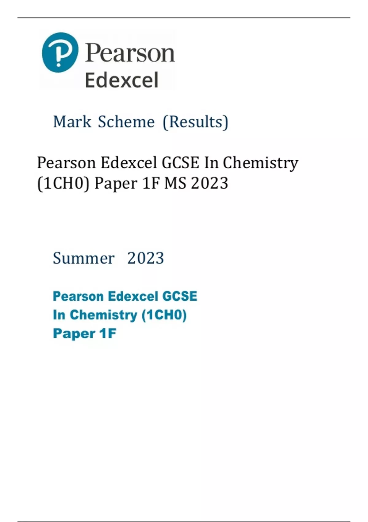 Pearson Edexcel GCSE In Chemistry (1CH0) Paper 1F MS 2023