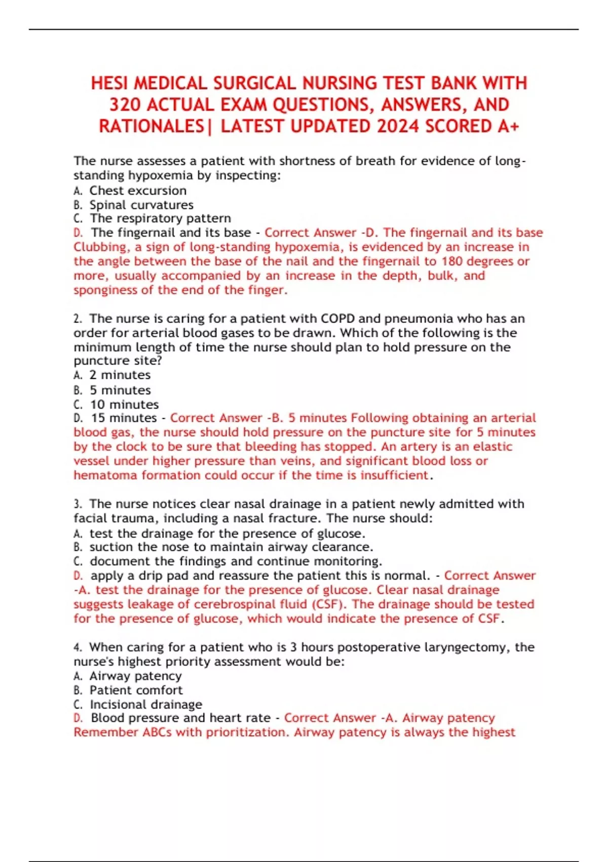 HESI MEDICAL SURGICAL NURSING TEST BANK WITH 320 ACTUAL EXAM QUESTIONS, ANSWERS, AND RATIONALES| LATEST UPDATED 2024 SCORED A+ The nurse assesses a patient with shortness of breath for evidence of longstanding hypoxemia by inspecting: A. Chest excursion B. Spinal curvatures C. The respiratory pattern D. The fingernail and its base - Correct Answer -D. The fingernail and its base Clubbing, a sign of long-standing hypoxemia, is evidenced by an increase in the angle between the base of the nail and the fingernail to 180 degrees or more, usually accompanied by an increase in the depth, bulk, and sponginess of the end of the finger. 2. The nurse is caring for a patient with COPD and pneumonia who has an order for arterial blood gases to be drawn. Which of the following is the minimum length of time the nurse should plan to hold pressure on the puncture site? A. 2 minutes B. 5 minutes C. 10 minutes D. 15 minutes - Correct Answer -B. 5 minutes Following obtaining an arterial blood gas, the nurse should hold pressure on the puncture site for 5 minutes by the clock to be sure that bleeding has stopped. An artery is an elastic vessel under higher pressure than veins, and significant blood loss or hematoma formation could occur if the time is insufficient. 3. The nurse notices clear nasal drainage in a patient newly admitted with facial trauma, including a nasal fracture. The nurse should: A. test the drainage for the presence of glucose. B. suction the nose to maintain airway clearance. C. document the findings and continue monitoring. D. apply a drip pad and reassure the patient this is normal. - Correct Answer -A. test the drainage for the presence of glucose. Clear nasal drainage suggests leakage of cerebrospinal fluid (CSF). The drainage should be tested for the presence of glucose, which would indicate the presence of CSF.