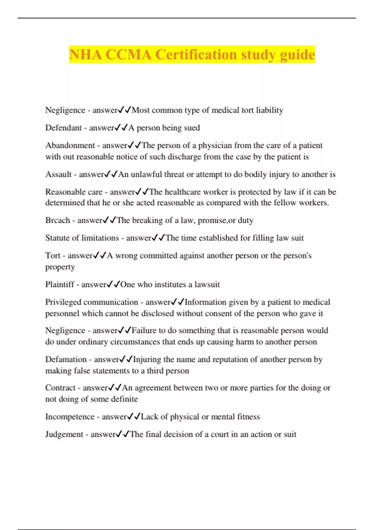 NHA CCMA Certification study guide Negligence - answerMost common type of medical tort liability Defendant - answerA person being sued Abandonment - answerThe person of a physician from the care of a patient with out reasonable notice of such discharge from the case by the patient is Assault - answerAn unlawful threat or attempt to do bodily injury to another is Reasonable care - answerThe healthcare worker is protected by law if it can be determined that he or she acted reasonable as compared with the fellow workers. Brcach - answerThe breaking of a law, promise,or duty Statute of limitations - answerThe time established for filling law suit Tort - answerA wrong committed against another person or the person's property Plaintiff - answerOne who institutes a lawsuit Privileged communication - answerInformation given by a patient to medical personnel which cannot be disclosed without consent of the person who gave it Negligence - answerFailure to do something that is reasonable person would do under ordinary circumstances that ends up causing harm to another person Defamation - answerInjuring the name and reputation of another person by making false statements to a third person