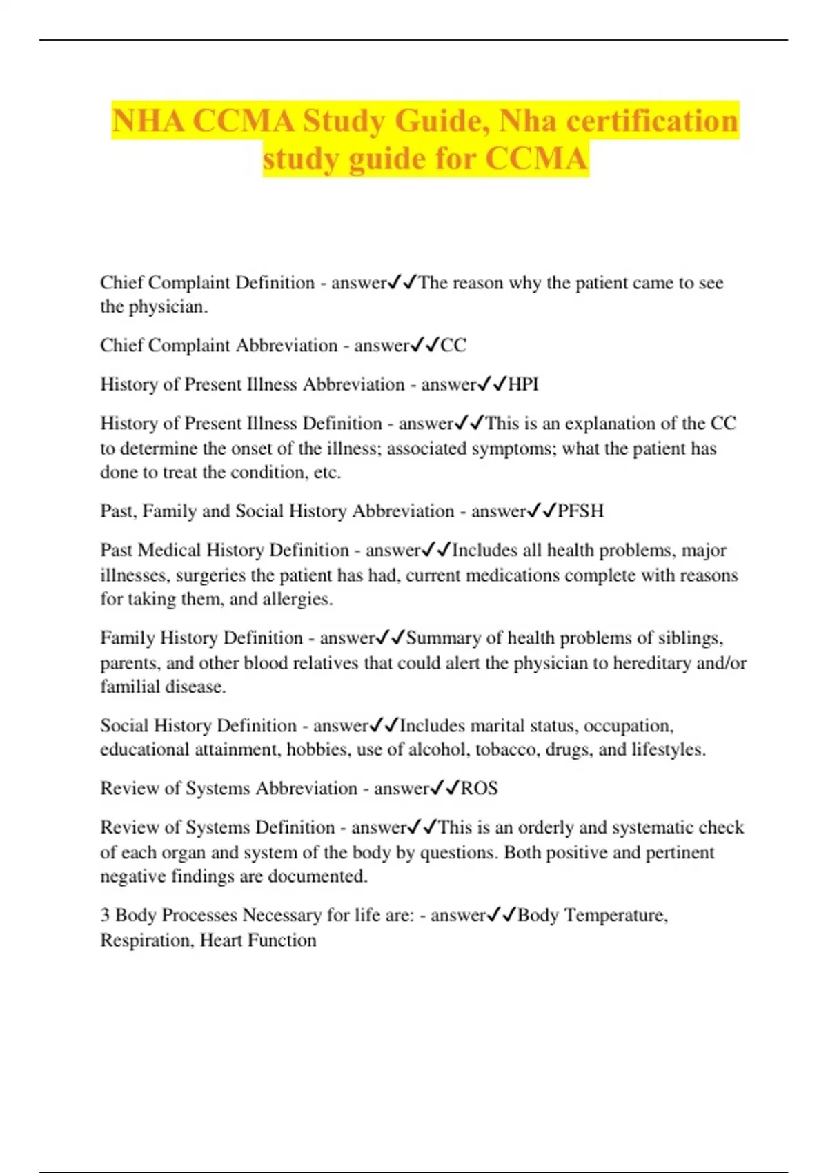 NHA CCMA Study Guide, Nha certification study guide for CCMA Chief Complaint Definition - answerThe reason why the patient came to see the physician. Chief Complaint Abbreviation - answerCC History of Present Illness Abbreviation - answerHPI History of Present Illness Definition - answerThis is an explanation of the CC to determine the onset of the illness; associated symptoms; what the patient has done to treat the condition, etc. Past, Family and Social History Abbreviation - answerPFSH Past Medical History Definition - answerIncludes all health problems, major illnesses, surgeries the patient has had, current medications complete with reasons for taking them, and allergies. Family History Definition - answerSummary of health problems of siblings, parents, and other blood relatives that could alert the physician to hereditary and/or familial disease. Social History Definition - answerIncludes marital status, occupation, educational attainment, hobbies, use of alcohol, tobacco, drugs, and lifestyles. Review of Systems Abbreviation - answerROS Review of Systems Definition - answerThis is an orderly and systematic check of each organ and system of the body by questions. Both positive and pertinent negative findings are documented. 3 Body Processes Necessary for life are: - answerBody Temperature, Respiration, Heart Function 4 Vital Signs of Body Function are: - answerTemperature, Pulse, Respiration, Blood Pressure Define Body Temperature - answerIs a balance between heart production and heart loss in conjunction with each other, maintained and regulated by the hypothalamus. Thermometers - answerAre used to measure temperature using the Fahrenheit and Centigrade or Celsius scale. Temperature Sites - answerMouth, Rectum, Ear (Tympanic Membrane), and the axilla (underarm). Normal Temperature Range for Rectal - answer98.6F to 100.6F 37.0C to 38.1C Normal Temperature Range for Oral - answer97.6F to 99.6F 36.5C to 37.5C Normal Temperature Range for Axillary - answer96.6F to 98.6F 35.9C to 37.0C Normal Temperature Range for Tympanic Membrane - answer98.6 F 37 C Define Febrile - answerPresence of Fever Define Afebrile - answerAbsence of Fever Define Fever - answerElevated body temperature beyond normal range. Intermittent Fever - answerFluctuating fever that returns to or below baseline then rises again. Remittent Fever - answerFluctuating fever that remains elevated; it does not return to baseline temperature. Continuous Fever - answerA fever that remains constant above the baseline; it does not fluctua