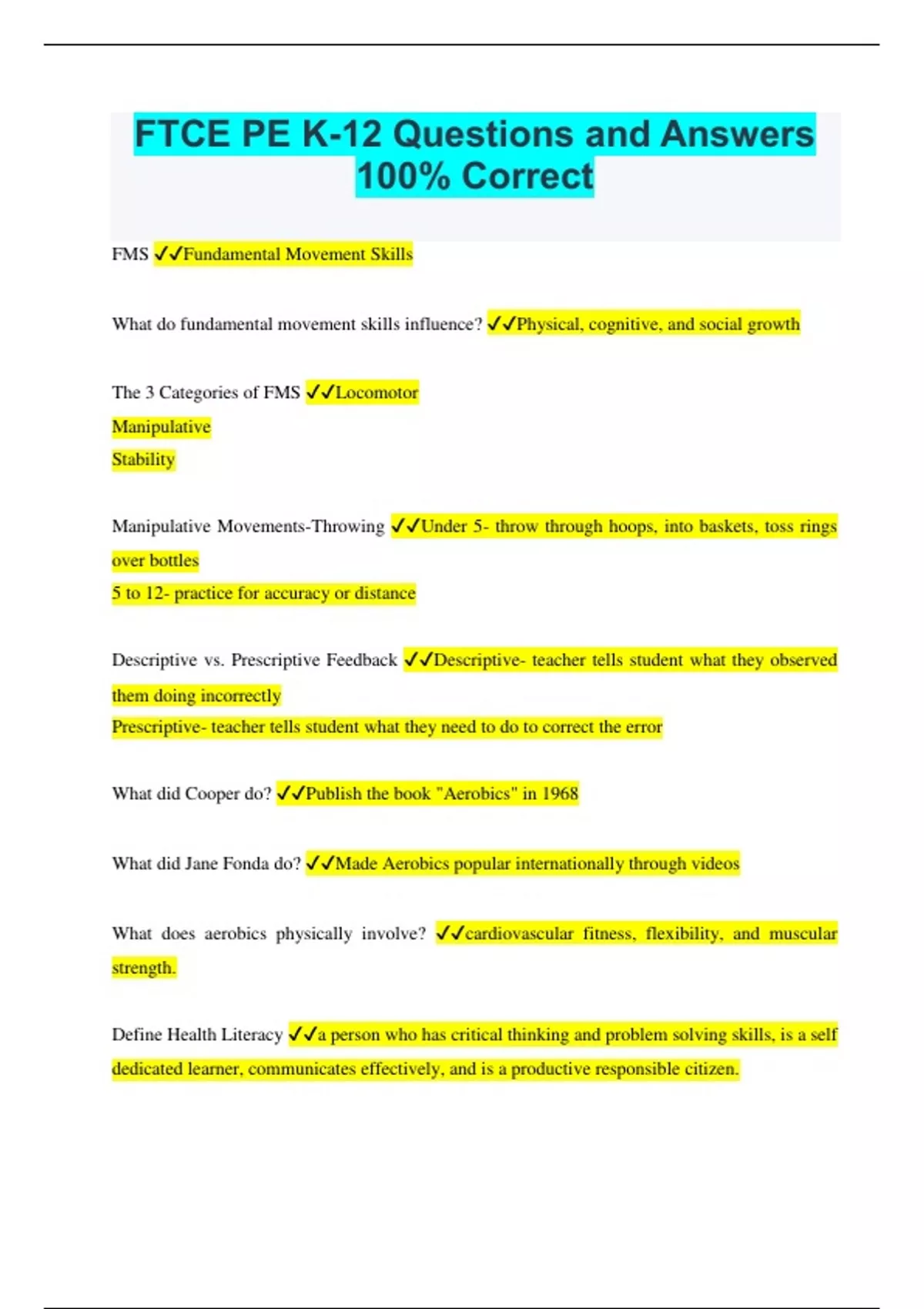 FTCE PE K-12 Questions and Answers 100% Correct
