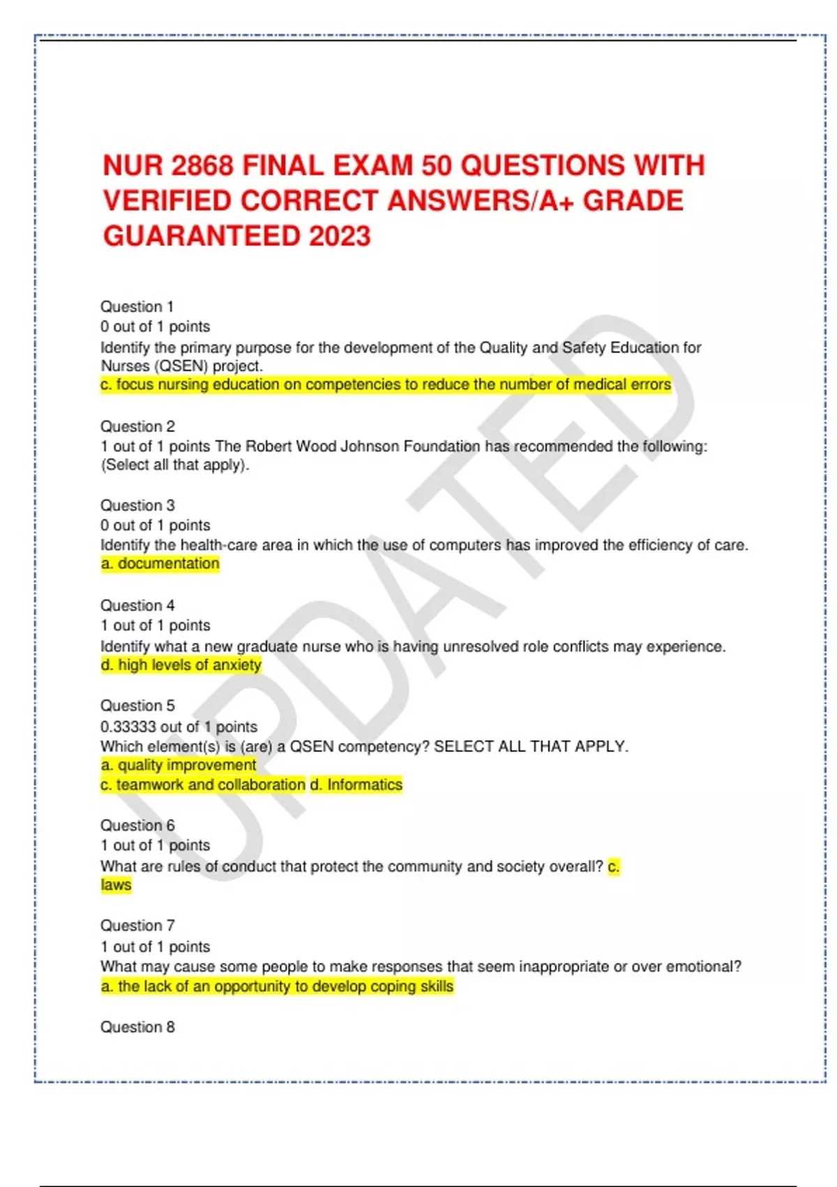 NUR 2868 FINAL EXAM 50 QUESTIONS WITH VERIFIED CORRECT ANSWERS/A+ GRADE GUARANTEED 2023 Identify the primary position advocated by the 1965 ANA Position Paper on Education for Nurses. ANS: baccalaureate education should be the basic level of preparation for professional nurse As nurses achieve increased professional autonomy, what must they also accept? ANS: ethical accountability Identify the underlying premise for evidence-based practice. ANS: Practice based on research produces better patient outcomes Identify the element that is the best indicator of increasing accountability in the profession of nursing. ANS: Demonstration of competency and high-quality care through peer review A leader with a low relationship/low task orientation presents a leadership style that is most similar to which leadership approach? ANS; Laissez-faire You overhear a newly graduated nurse telling one of your colleagues that leadership and management belong to the unit manager and not to her. Your response demonstrates understanding that the what about the perception of the new graduate?