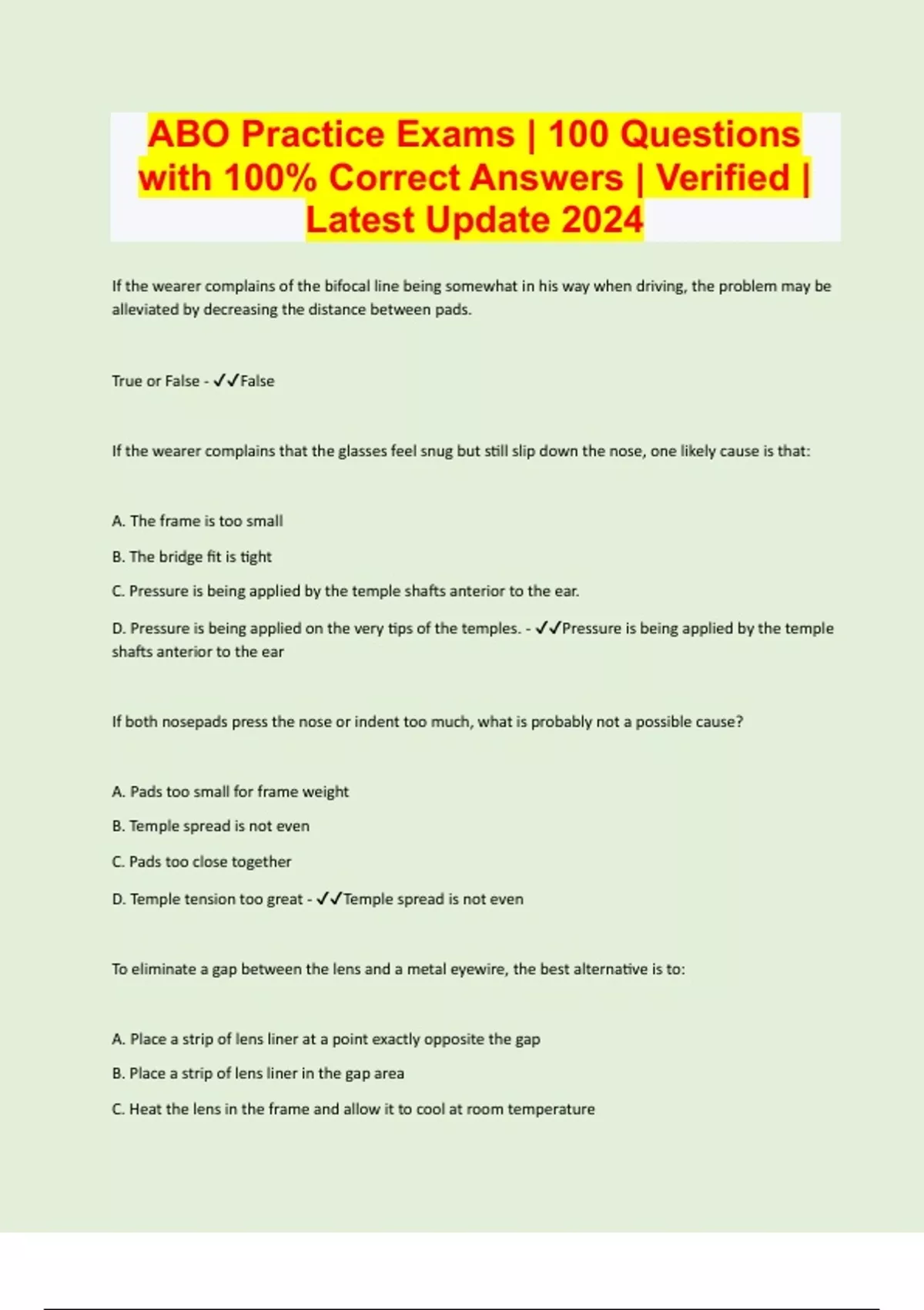 ABO Practice Exams | 100 Questions with 100% Correct Answers | Verified | Latest Update 2024