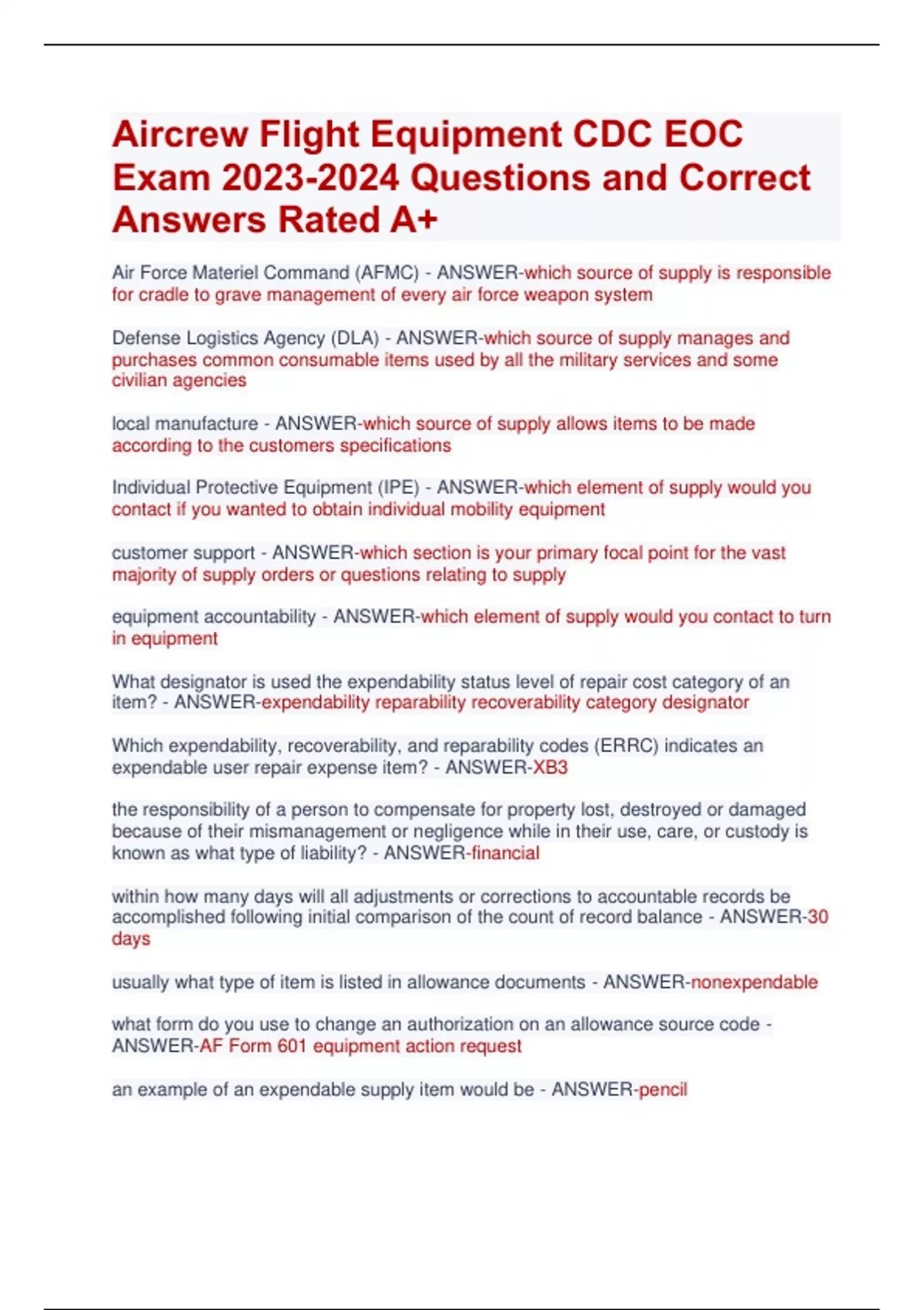 Aircrew Flight Equipment CDC EOC Exam Questions and Correct Answers Rated A+