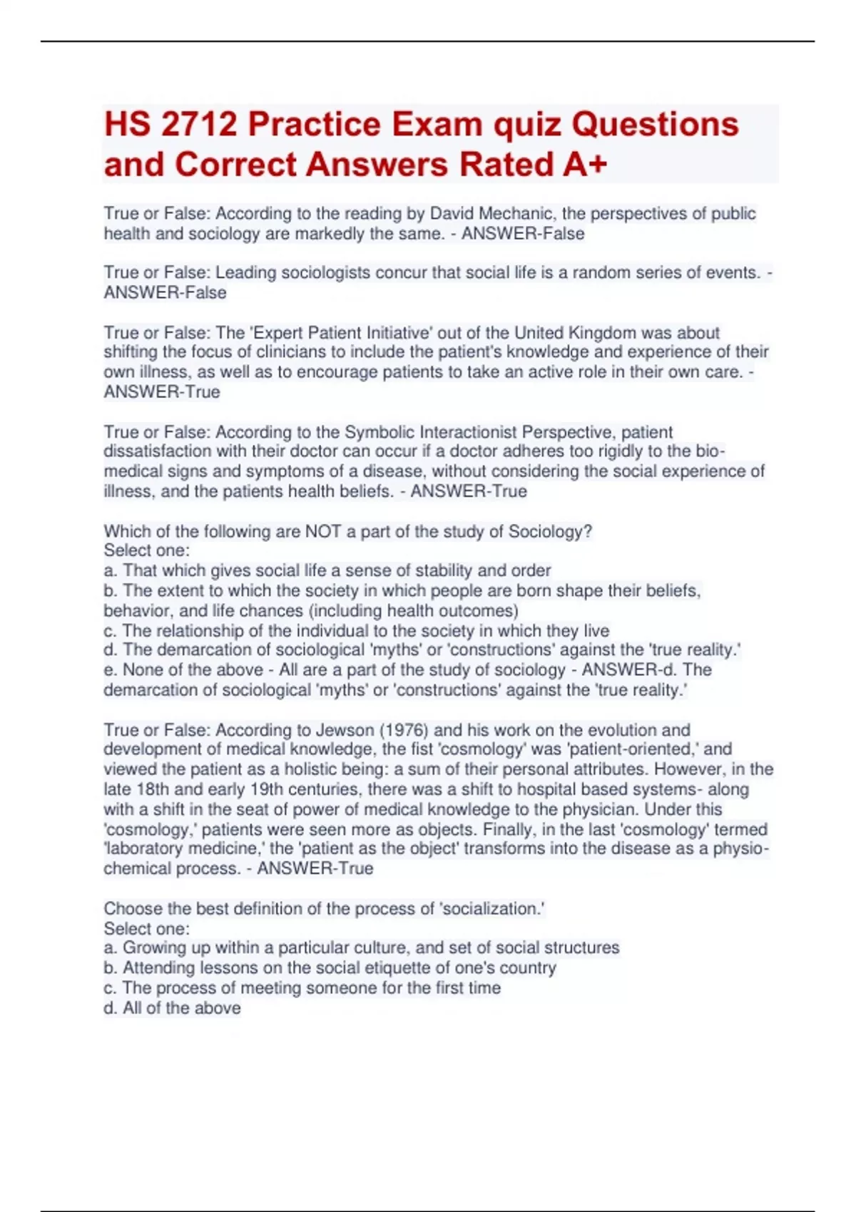 HS 2712 Practice Exam quiz Questions and Correct Answers Rated A+