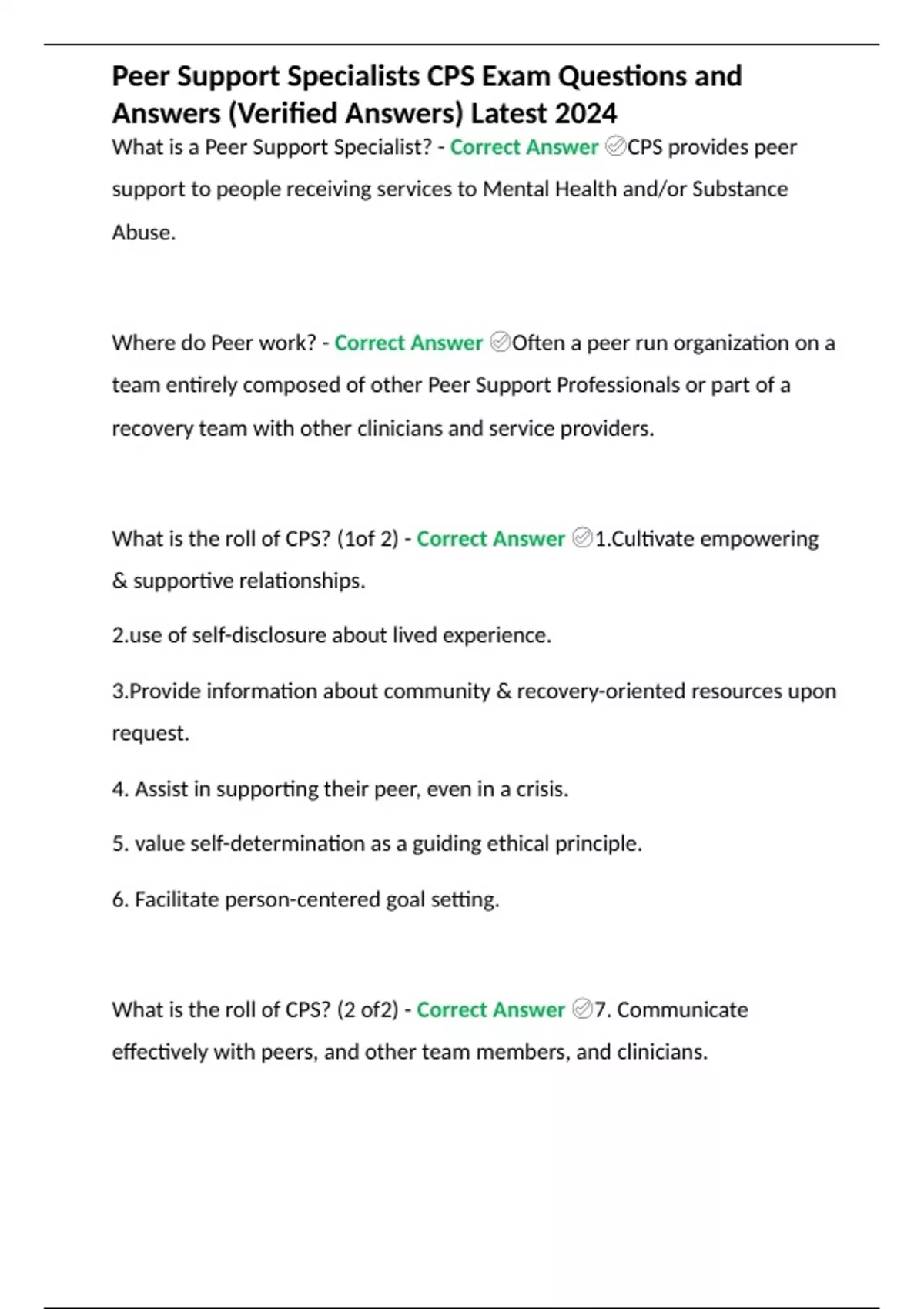 Peer Support Specialists CPS Exam Questions and Answers (Verified Answers) Latest 2024