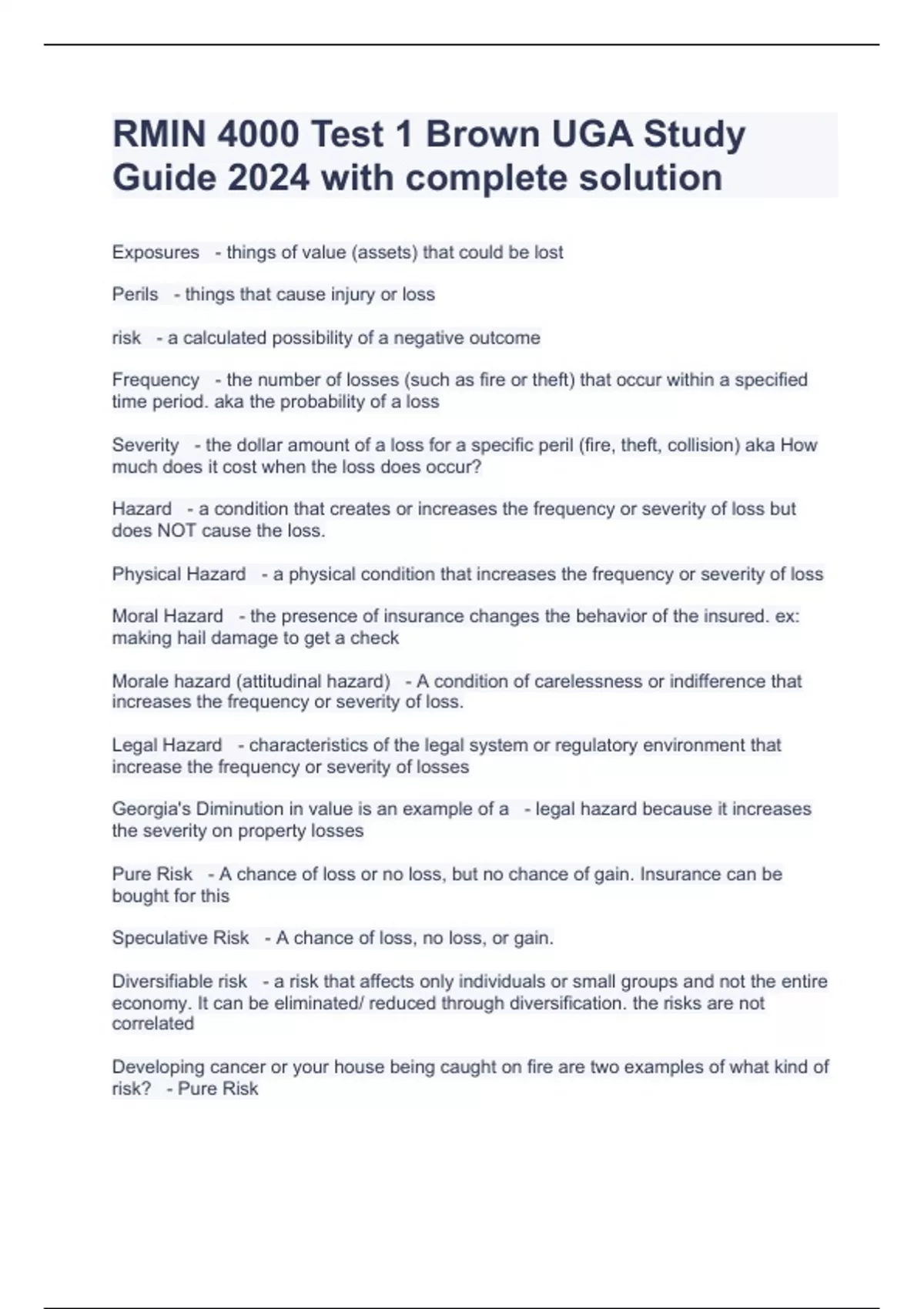 RMIN 4000 Test 1 Brown UGA Study Guide 2024 with complete solution