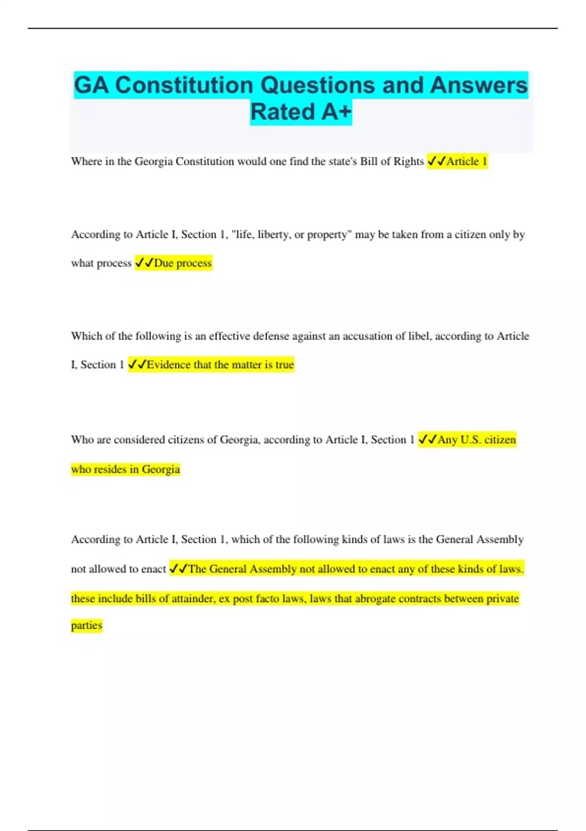 GA Constitution Questions and Answers Rated A+ Where in the Georgia Constitution would one find the state's Bill of Rights Article 1 According to Article I, Section 1, "life, liberty, or property" may be taken from a citizen only by what process Due process Which of the following is an effective defense against an accusation of libel, according to Article I, Section 1 Evidence that the matter is true Who are considered citizens of Georgia, according to Article I, Section 1 Any U.S. citizen who resides in Georgia According to Article I, Section 1, which of the following kinds of laws is the General Assembly not allowed to enact The General Assembly not allowed to enact any of these kinds of laws. these include bills of attainder, ex post facto laws, laws that abrogate contracts between private parties According to Article I, Section 1, which of the following kinds of laws is the General Assembly permitted to enact Right to trial by jury; number of jurors; selection and compensation of jurors. According to Article I, Section 1, which of the following is the ultimate authority to determine the facts at issue in a trial The Jury According to Article I, Section 1, under what circumstance may a person not be placed on trial for the same offense for a second time For the same offense except when a new trial has been granted after conviction or in case of mistrial; same evidence, same offense= no second trial "in case the prosecuting attorney has uncovered additional evidence about the crime" According to Article I, Section 1, which of the following is not adequate for an accused individual to be convicted of treason Conviction requires testimony of two witnesses to same overt act/open confession According to Article I, Section 1, which of the following may not be done to a person convicted of a crime Work corruption of blood or forfeiture of estate, banishment or whipping Under what circumstance may a debtor be imprisoned on account of his debt Never According to Article I, Section 2, which of the following kinds of legislative enactments is an acceptable enactment (i.e., which of the following kinds is not void) The power of the courts to punish for contempt shall be limited by legislative acts. Legislative acts in violation of this Constitution or the Constitution of the United States are void. The General Assembly may by law define a nonprofit bingo game and provide for the regulation of nonprofit bingo games. Same for lotteries. The General Assembly may waive the state's sovereign immunity from suit by enacting a State Tort Claims Act What is the meaning of the term "sovereign immunity" Prevents the government or its political subdivisions, departments, and agencies from being sued without its consent According to Article II, Section 1, which of the following is not an acceptable requirement that may be established for voting Requirements: US citizen and GA resident, 18+ yo. Mentally incompetent and felons cannot vote According to Article II, Section 2, who collects ballots and election returns Election officials By definition, what would give rise to a "run-off election" No candidate wins majority of votes, voting is held again for the top two candidates By definition, what is the possible result of a "recall" election An incumbent officeholder might be removed from office If an elected official is indicted by a grand jury on felony charges, what happens to the elected official /Immediately suspended if determined by the review commission, still receives compensation What does "legislative power" allow a politician