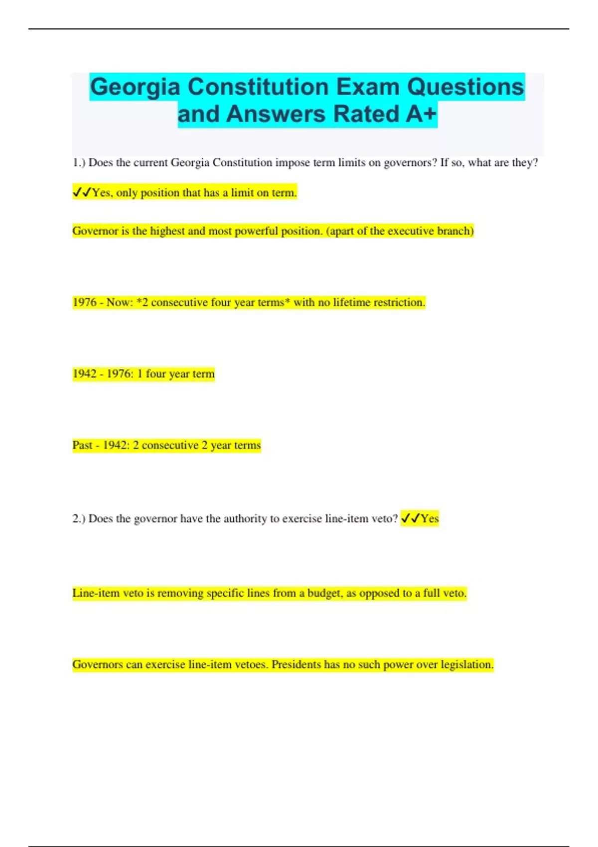Georgia Constitution Exam Questions and Answers Rated A+ 1.) Does the current Georgia Constitution impose term limits on governors? If so, what are they? Yes, only position that has a limit on term. Governor is the highest and most powerful position. (apart of the executive branch) 1976 - Now: *2 consecutive four year terms* with no lifetime restriction. : 1 four year term Past - 1942: 2 consecutive 2 year terms 2.) Does the governor have the authority to exercise line-item veto? Yes Line-item veto is removing specific lines from a budget, as opposed to a full veto. Governors can exercise line-item vetoes. Presidents has no such power over legislation. 3.) Who has the power of executive clemency in the Georgia Constitution? The State Board of Pardons and Paroles executive clemency. n. the power of a President in federal criminal cases, and the Governor in state convictions, to pardon a person convicted of a crime, commute the sentence (shorten it, often to time already served) or reduce it from death to another lesser sentence. 4.) What are the citizenship and residency requirements for Senate and House of GA and US? Georgia House and Senate - must have residency in GA for 2 years and at least 1 year in district that she will represent House - 21 Senate - 25 US House - must be *25* years old, a citizen of the US for at least *7 years* prior to the election, a resident of the state that he or she has chosen to represent US Senate - must be *30* years old, a citizen of the US for at least *9 years* prior to election , a resident of the state represented 5.) What are the responsibilities of the lieutenant governor in Georgia? Lieutenant governor = Leader (President of Senate) oversees committee on senate membership. They do not run with governor, elected separately. Elected Constitutional Officers 1. Governor 2. Lieutenant Gov 3. Attorney General 4. Sec of State 5. School Superintendent 6. Agriculture 7. Insurance 8. Labor 6.) Besides the governor and lieutenant governor, who else are elected executive officers? * In total, there are 8 *elected constitutional officers* 1. Governor 2. Lieutenant