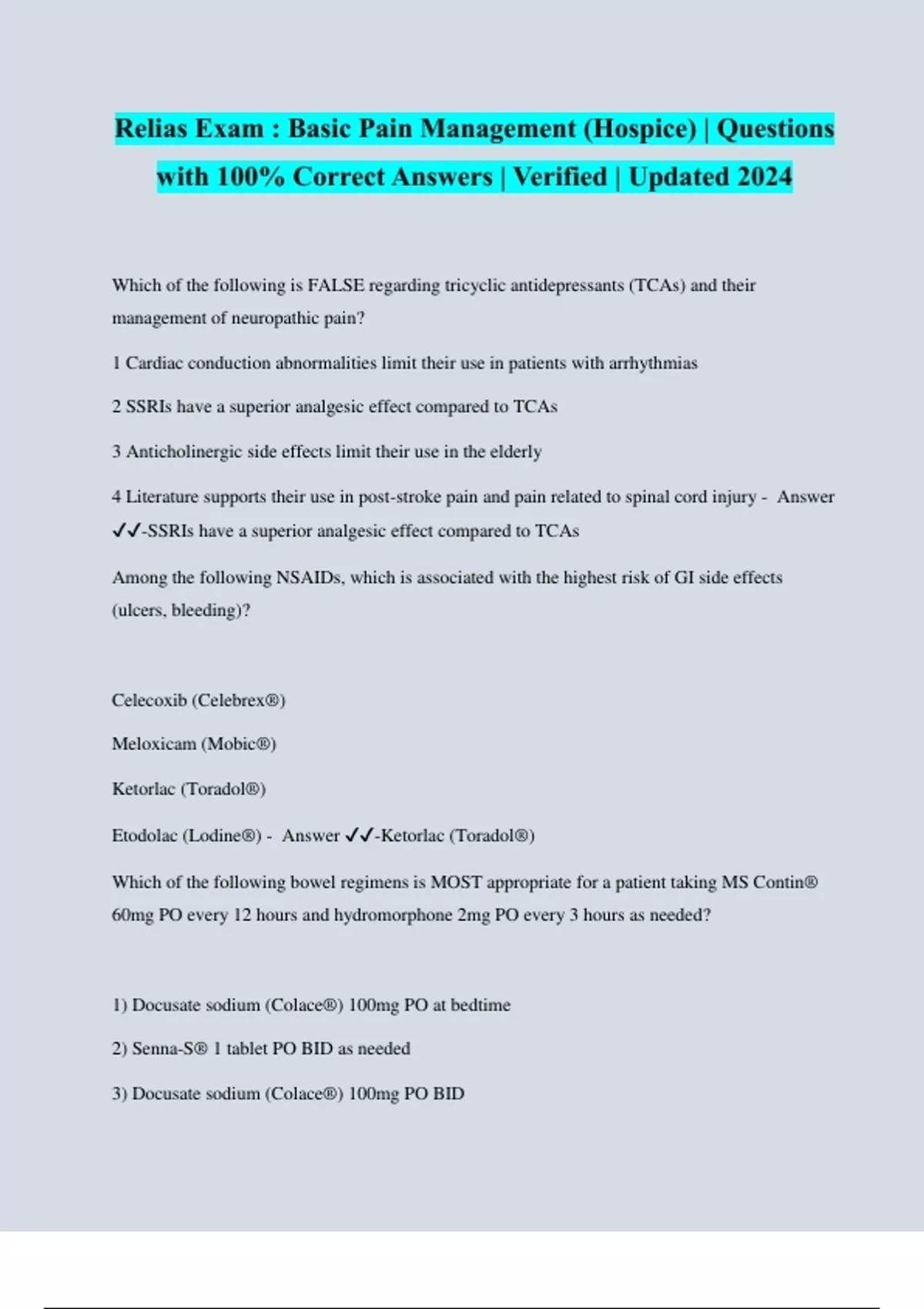 Relias Exam : Basic Pain Management (Hospice) | Questions with 100% Correct Answers | Verified | Updated 2024