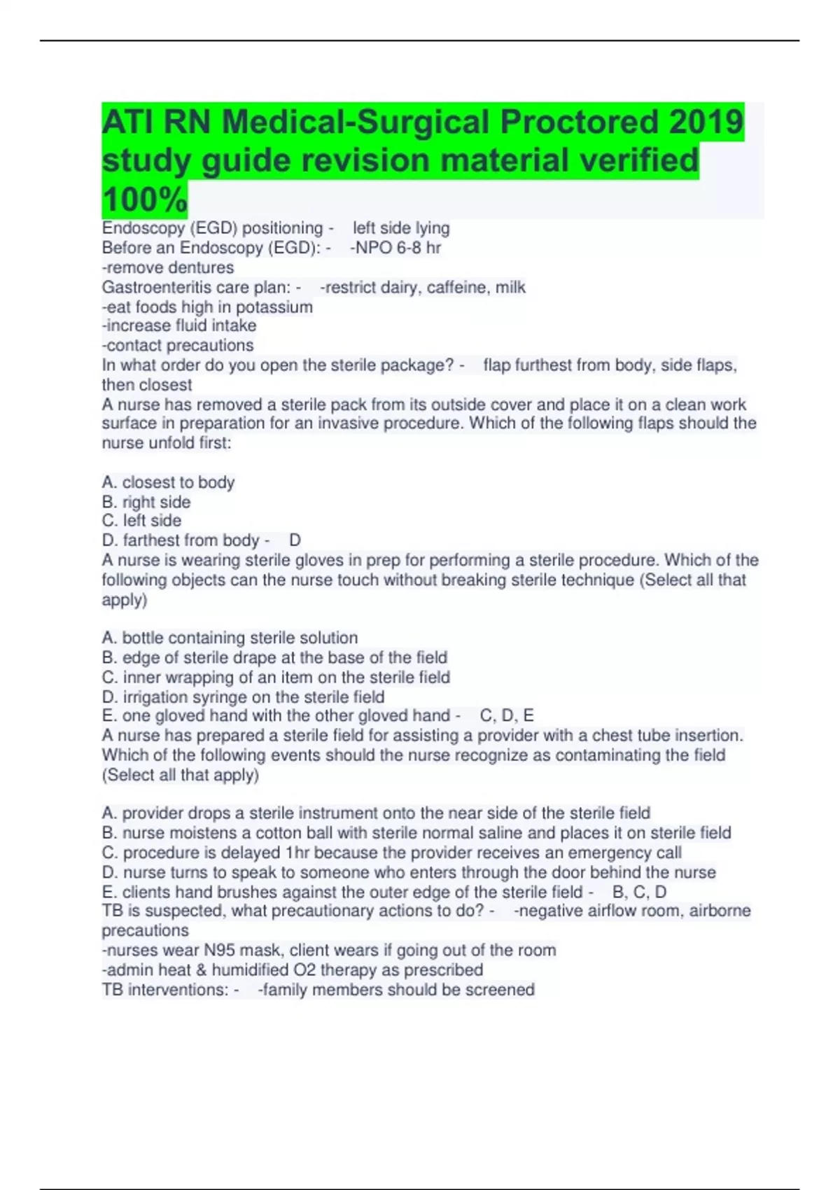 ATI RN Medical-Surgical Proctored 2019 study guide revision material verified 100% Endoscopy (EGD) positioning - left side lying Before an Endoscopy (EGD): - -NPO 6-8 hr -remove dentures Gastroenteritis care plan: - -restrict dairy, caffeine, milk -eat foods high in potassium -increase fluid intake -contact precautions In what order do you open the sterile package? - flap furthest from body, side flaps, then closest A nurse has removed a sterile pack from its outside cover and place it on a clean work surface in preparation for an invasive procedure. Which of the following flaps should the nurse unfold first: A. closest to body B. right side C. left side D. farthest from body - D A nurse is wearing sterile gloves in prep for performing a sterile procedure. Which of the following objects can the nurse touch without breaking sterile technique (Select all that apply) A. bottle containing sterile solution B. edge of sterile drape at the base of the field C. inner wrapping of an item on the sterile field D. irrigation syringe on the sterile field E. one gloved hand with the other gloved hand - C, D, E A nurse has prepared a sterile field for assisting a provider with a chest tube insertion. Which of the following events should the nurse recognize as contaminating the field (Select all that apply) A. provider drops a sterile instrument onto the near side of the sterile field B. nurse moistens a cotton ball with sterile normal saline and places it on sterile field C. procedure is delayed 1hr because the provider receives an emergency call D. nurse turns to speak to someone who enters through the door behind the nurse E. clients hand brushes against the outer edge of the sterile field - B, C, D TB is suspected, what precautionary actions to do? - -negative airflow room, airborne precautions -nurses wear N95 mask, client wears if going out of the room -admin heat & humidified O2 therapy as prescribed TB interventions: - -family members should be screened -4 meds taken for 6-12 months -not contagious when they have 3 negative sputum cultures What to watch for when on Isoniazid: - numb/tingling in the hands & feet What to watch for when on Rifampin: - -orange secretions normal -watch for jaundice -interferes with birth control What to watch for when on Ethambutol: - vision changes Client teaching for genital herpes: - -can be transmitted with or w/out blisters -sexual partners should be informed & screened -no cure, just meds to help w/symptoms -abstain from intercourse until lesions are completely healed -gently clean areas w/mild soap & water Caring for a client following a stroke of the right side with left-sided hemipalegia: - - thicken liquids/foods -high fowlers -speech therapist for helping w/eating & speech -monitor gag reflex/swallowing abilities -have suction equipment available -occupational therapy -support left arm with pillows, slings, etc High sodium foods clients with HF & Pulmonary edema should avoid: - -cheese -soups -bread -cold cuts/cured meats -pizza -eggs & omelets -hot dogs -baked ham Which non-opioid drug decreases the effect of aspirin? - ibuprofen Ketorolac should not be used concurrently with... - other NSAIDS Glucocorticoids increase the risk of gastric bleeding when taken with... - non-opioid analgesics To access an implanted port, you must use a... - noncoring (Huber) needle When done accessing an implanted port... - flush with 10 mL 0.9% sodium chloride Therapeutic effects of furosemide (Lasix) - -decreases preload of the heart -decreases potassium levels -increases urine output -decrease BP -decrease edema Valsartan for HF expected outcomes/findings: - -vasodilation -excretion of sodium & water -reduces BP -reduces risk of mortality in post-MI pts left w/vent dysfunction Expected findings of meds that increase urinary output (diuretics): - -decreased potassium -weight loss -decrease in edema -decreased calcium -increased urine output -decreased BP -decrease in ICP & IOP Client teaching for Nitroglycerin: - 1. stop activity & rest 2. place nitro tab under tongue 3. if pain is unrelieved in 5 min, call 911 or go to ED 4. take 2 or more doses at 5 min intervals -headache is a common side effect of nitro Which foods should the client on Warfarin avoid? - dark leafy green veggies Client teaching for anticoagulant therapy: - -bleeding precautions -no added meds that increase bleeding -on it for 6-8 weeks prior to hematologic dx procedure -must have blood levels checked often -monitor vitamin K in their diet Expected prescriptions for Hypertension: - -furosemide (Lasix) -aldactone (potassium sparing diuretic) -hydrochlorothiazide (diuretic) -verapamil, dilitiazem (CCB) -captopril, lisinopril (ACE inhibitors) -losartan, telmisartan (ARBs) -eplerenone -atenolol, metoprolol (Beta blockers) -clonidine -prazosin (minipress) Contraindications for Nadolol: - -asthma -sinus bradycardia -cardiogenic shock -cardiac failure -diabetes -pregnancy -right side HF -emphysema -severe COPD Treatment for diabetes insipidus: - -daily weights -no caffeine or alcohol -desmopressin acetate/DDVAP -aqueous vasopressin/Pitressin -carbamazepine (tegretol) -high fiber diet Meds for DI, what to look out for/do: - -adjust based on urine output -daily weights -inform of weight gain of 2 lb in 24 hr -notify if headaches or confusion occur -monitor for infection -monitor for dizziness/drowsiness Protein requirement of an adult: _____g of protein per kg - 0.8 g Caring for a client who has pancreatitis: - -keep NPO -NG tube to suction gastric contents -low fat, high protein, high carb diet Risk factors: -high fat diet -excessive alcohol consumption -age Expected lab findings for a client with pancreatitis: - -increased amylase & lipase -increased WBC -decreased platelets -increased glucose -increased liver enzymes & bilirubin -elevated ESR -decreased calcium & magnesium What med do you give for symptomatic bradycardia? What electrical management? - med=atropine elec= pacemaker insertion What med/meds do you 