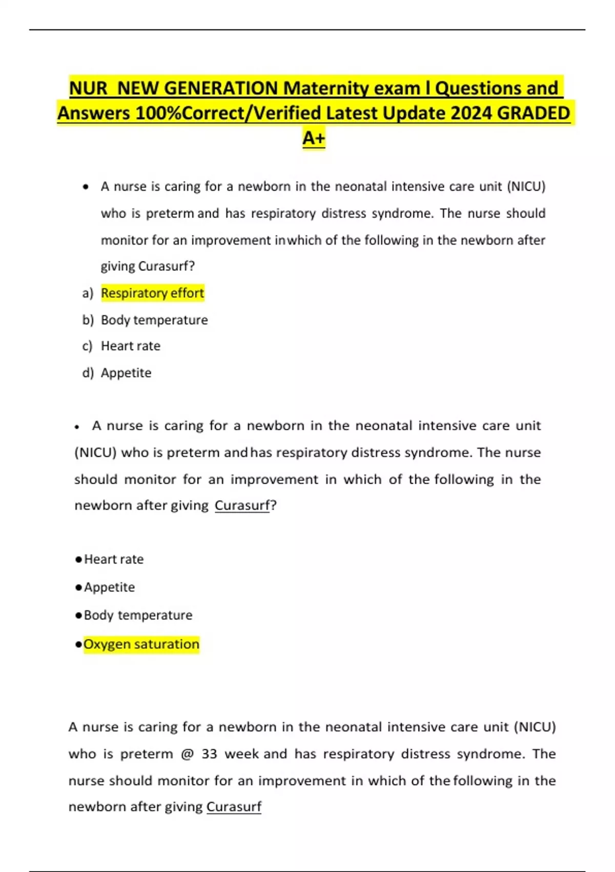 NUR NEW GENERATION Maternity exam l Questions and Answers 100%Correct/Verified Latest Update 2024 GRADED A+ A nurse is caring for a newborn in the neonatal intensive care unit (NICU) who is preterm and has respiratory distress syndrome. The nurse should monitor for an improvement in which of the following in the newborn after giving Curasurf? a)Respiratory effort b)Body temperature c)Heart rate d)Appetite A nurse is caring for a newborn in the neonatal intensive care unit (NICU) who is preterm and has respiratory distress syndrome. The nurse should monitor for an improvement in which of the following in the newborn after giving Curasurf? ●Heart rate ●Appetite ●Body temperature ●Oxygen saturation A nurse is caring for a newborn in the neonatal intensive care unit (NICU) who is preterm @ 33 week and has respiratory distress syndrome. The nurse should monitor for an improvement in which of the following in the newborn after giving Curasurf a)Respiratory effort b)Body temperature c)Heart rate d)Appetite The nurse admits the term newborn who is at risk for developing neonatal abstinence syndrome (NAS) The nurse correctly places the newborn in which location? a)The general nursery with 8 other infants b)A small, darkened nursey with two other NAS newborns c)Alone in a bright lighted nursery d)Right next to the nurses station The nurse is reviewing car seat safety with the new parents at discharge. The instructions are to place the car seat a)Rear facing in the middle of the back row b)Rear facing on the right side of the back row c)Rear facing on the left side of the back row d)Forward facing in the middle of the back row A nurse is observing a postpartum woman and her partner interact with their newborn. The nurse determines that the parents may not be developing normal parental attachment (bonding) with their newborn when they demonstrate the following behavior: a)Comparing facial features between themselves and the newborn b) Frequently asking for the newborn to be taken from the room c)Making direct eye contact with the newborn