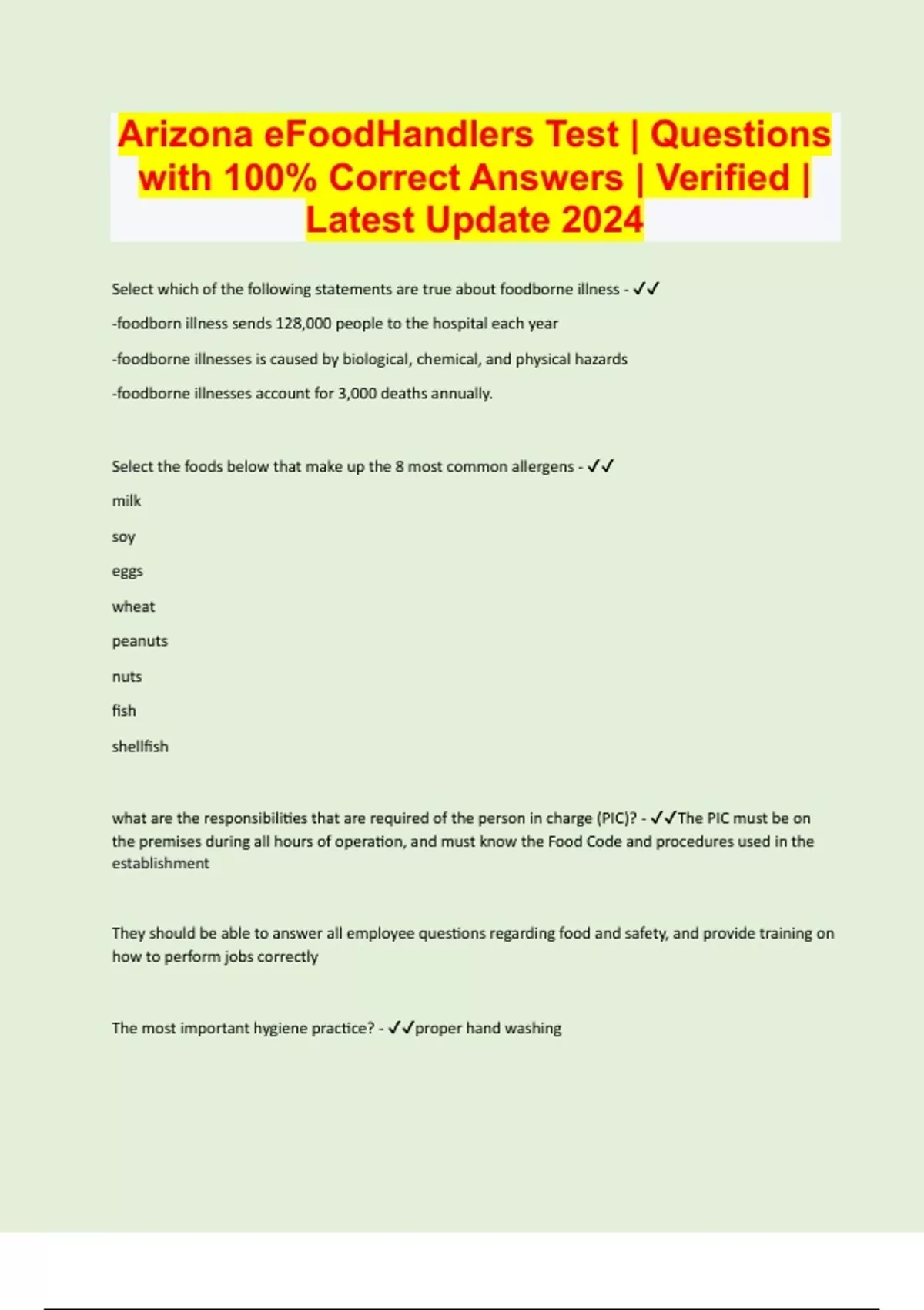 Arizona eFoodHandlers Test | Questions with 100% Correct Answers | Verified | Latest Update 2024