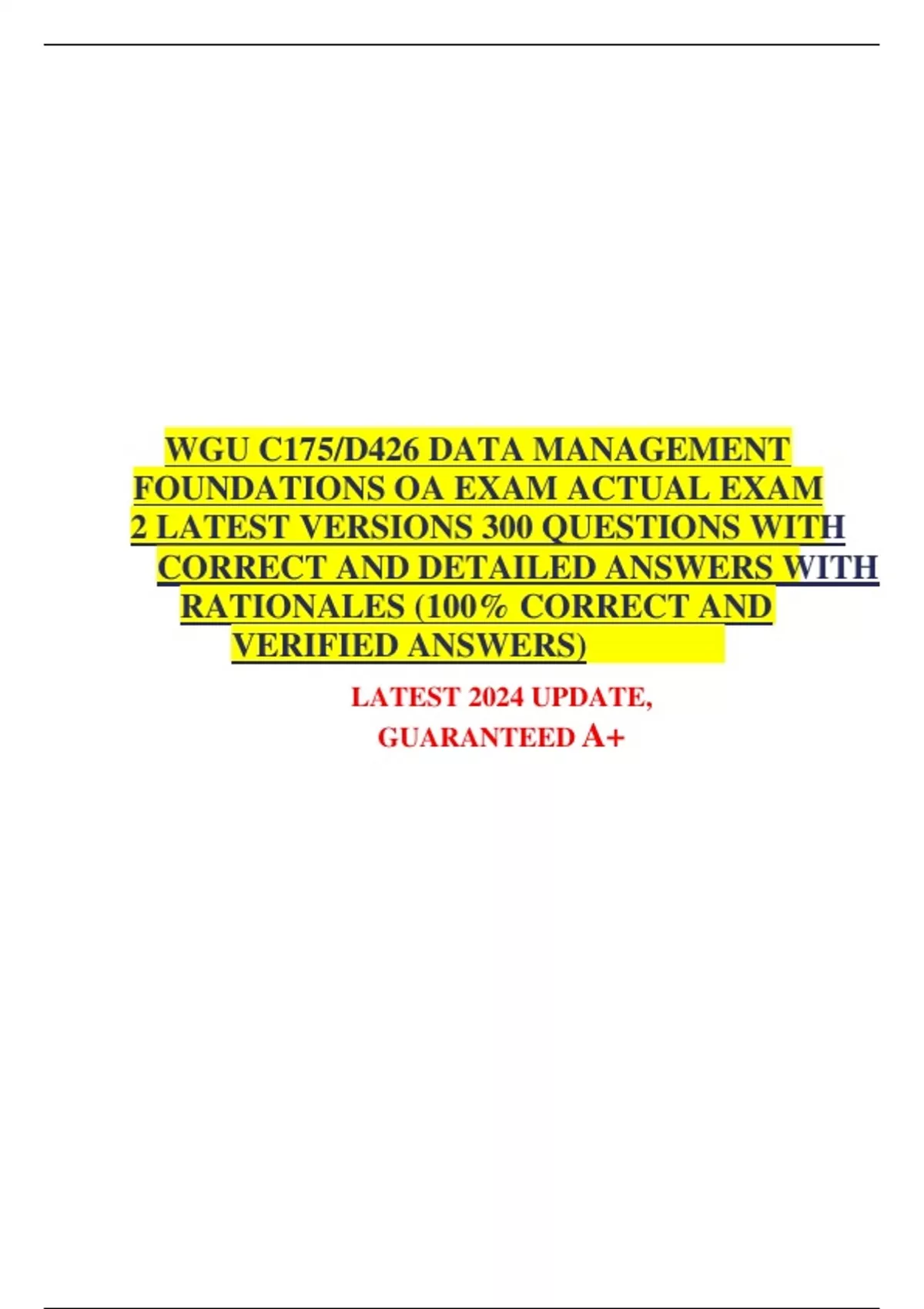 WGU C175/D426 DATA MANAGEMENT FOUNDATIONS OA EXAM ACTUAL EXAM 2 LATEST VERSIONS 300 QUESTIONS WITH CORRECT AND DETAILED ANSWERS WITH RATIONALES (100% CORRECT AND VERIFIED ANSWERS). LATEST 2024 UPDATE, GUARANTEED A+