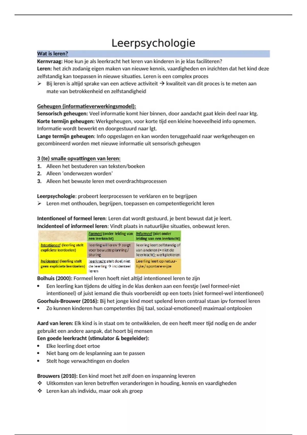 Samenvatting leerpsychologie Met de hoofdstukken: - Wat is leren? - Behaviorisme - Cognitivisme - Constructivisme - Breinleren - Onderwijsvernieuwers - Bewezen effectieve leer- en instructiestrategieën - Motorisch leren - Creatief leren 22 pagina's met duidelijke plaatjes, tabellen en genoeg informatie.