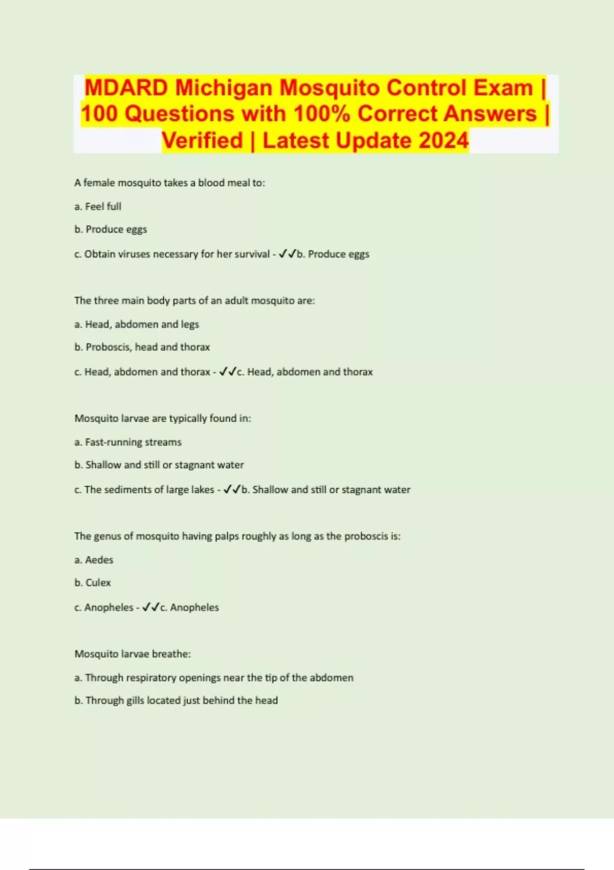 MDARD Michigan Mosquito Control Exam | 100 Questions with 100% Correct Answers | Verified | Latest Update 2024