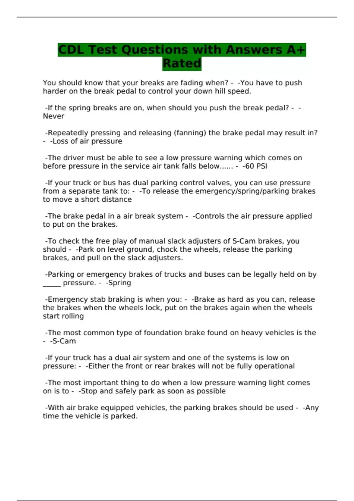 CDL Test Questions with Answers A+ Rated