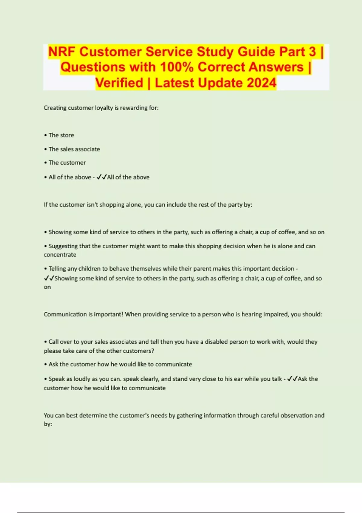 NRF Customer Service Study Guide Part 3 | Questions with 100% Correct Answers | Verified | Latest Update 2024