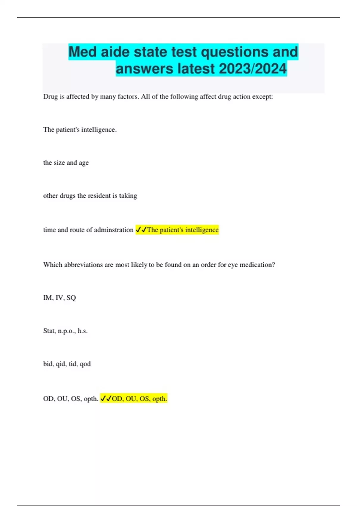 Drug is affected by many factors. All of the following affect drug action except: The patient's intelligence. the size and age other drugs the resident is taking time and route of adminstration The patient's intelligence Which abbreviations are most likely to be found on an order for eye medication? IM, IV, SQ Stat, n.p.o., h.s. bid, qid, tid, qod OD, OU, OS, opth. OD, OU, OS, opth. Med aide state test questions and answers latest 2023/2024The drug name owned by the manufacturer is called the: brand name product name trade name all of the above all of the above Pharmacokinetics is the study of: the study of prescription drugs only the signs and symptoms of disease the absorption, distribution, metabolism, and excretion of drugs none of the above the absorption, distribution, metabolism, and excretion of drugs Examples of drugs made from animal sources are: insulin and heparinfurosemide and castor oil magnesium hydrochloride and iodine iron and calcium insulin and heparin A patient may take two drugs for hyperten