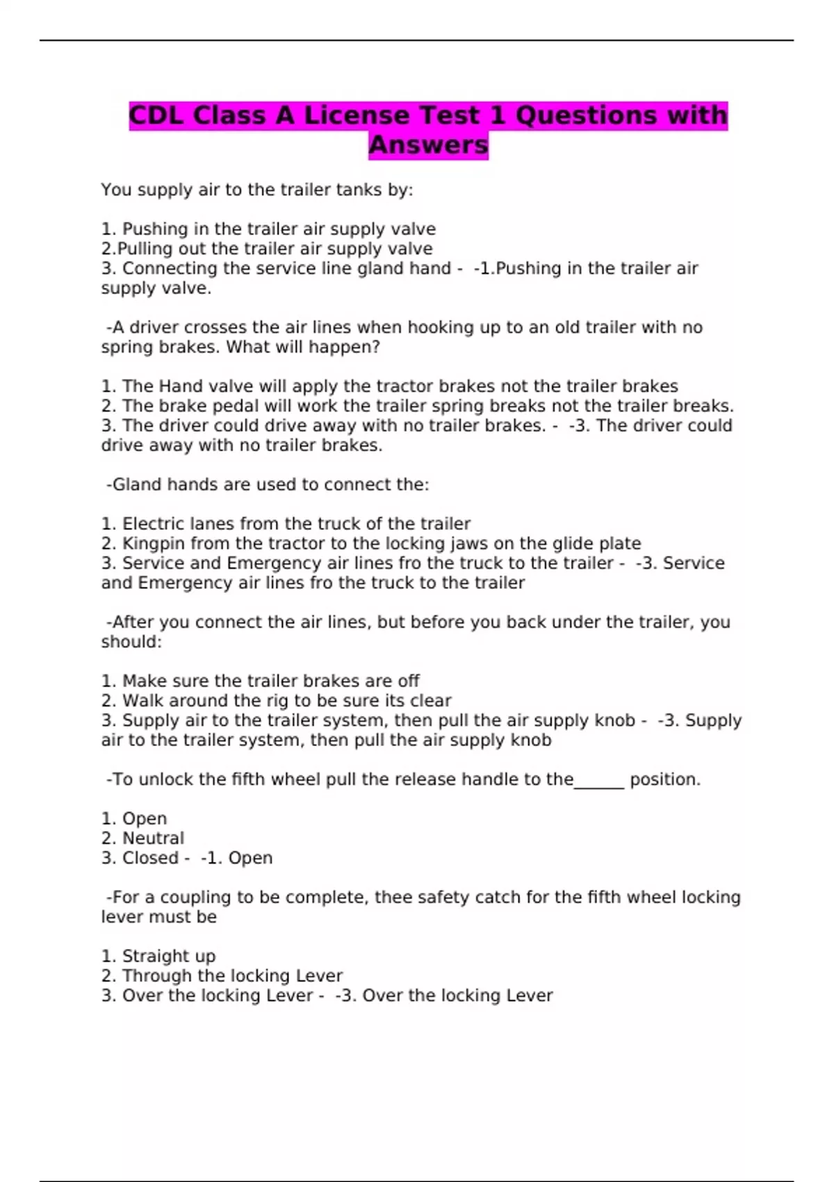 cdl class a license test 1 questions with answers